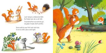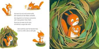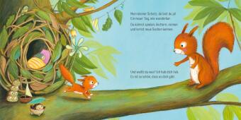 In diesem ersten Bilderbuch begleiten die kleinsten Leserinnen und Leser das niedliche Eichhörnchenkind vom Aufstehen bis zum Schlafengehen. Sie lernen die Tiere kennen, mit denen es spielt und erfahren, dass es auch einmal wütend oder ängstlich ist. Und sie erleben mit, dass das große Eichhörnchen immer da ist, wenn das kleine es braucht. Mal hilft eine kuschelige Umarmung, mal ein ermutigender kleiner Stupser.