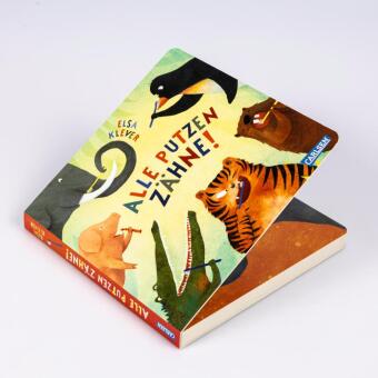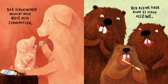 Alle putzen Zähne! Gar keine Frage. Wie all die Tiere in diesem witzigen Buch so bestimmt auch jedes Kind! Die Maus bringt die Zahnpasta und dann geht es los, der Reihe nach: Jedes Tier putzt auf ganz eigene Weise die Zähne. Beim Krokodil mit den vielen Zähnen dauert es etwas länger, der Oktopus putzt gleichzeitig acht anderen Meeresbewohnern die Kauleisten, der Hamster hat ein bisschen viel Pasta genommen und produziert viel Schaum, der kleine Hund bekommt Hilfe und der Bär benutzt eine elektrische Zahnbürste. Das Kätzchen ist bockig und will gar keine Zähne putzen. Zuerst. Aber am Ende dann doch!