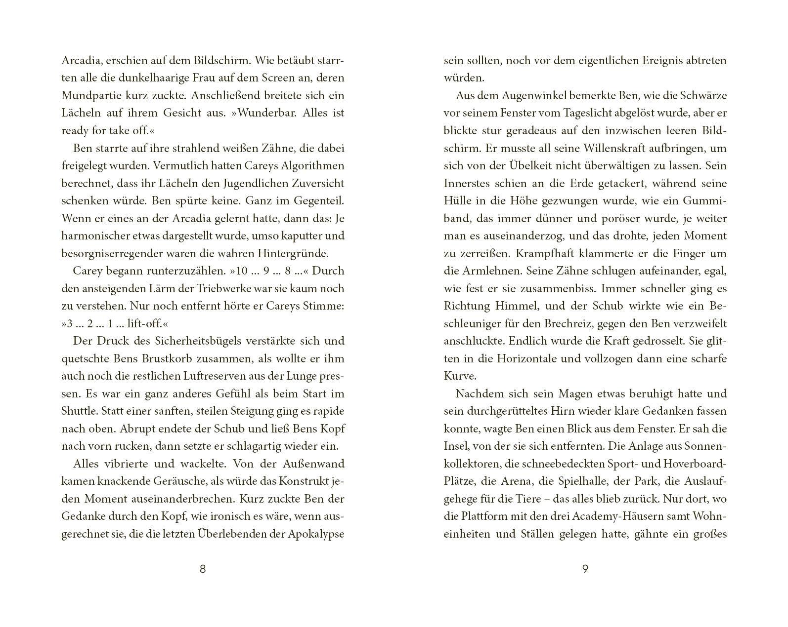 Zwei Helden wider Willen - können sie den Untergang der Welt verhindern? Emily und Ben wissen nun, welches Ziel auf der Elite-Akademie Arcadia tatsächlich verfolgt wird. Ohne ihr Wissen sind die Schüler darauf vorbereitet worden, nach dem bevorstehenden Klimakollaps die Entstehung einer neuen Zivilisation auf der Erde mitzugestalten. Doch bevor es so weit ist, sollen sie zuerst an einen geheimen und sicheren Ort gebracht werden, um ihr Überleben zu gewährleisten. Der Preis dafür ist allerdings hoch, denn sie werden ihre Familien nie wiedersehen. Nicht alle der jungen Tech-Genies sind bereit, ihn zu zahlen, und es formiert sich Widerstand. Emily und Ben müssen entscheiden, was ihnen wichtiger ist, ihre eigene Zukunft oder das Überleben der Menschen, die sie lieben ... Das umwerfende Finale der hochspannenden Action-Abenteuer-Fantasy-Dilogie Die Bände der »Arcadia«-Reihe: Arcadia - Die Auserwählten (Band 1) Arcadia - Die Zukunft der Welt (Band 2)