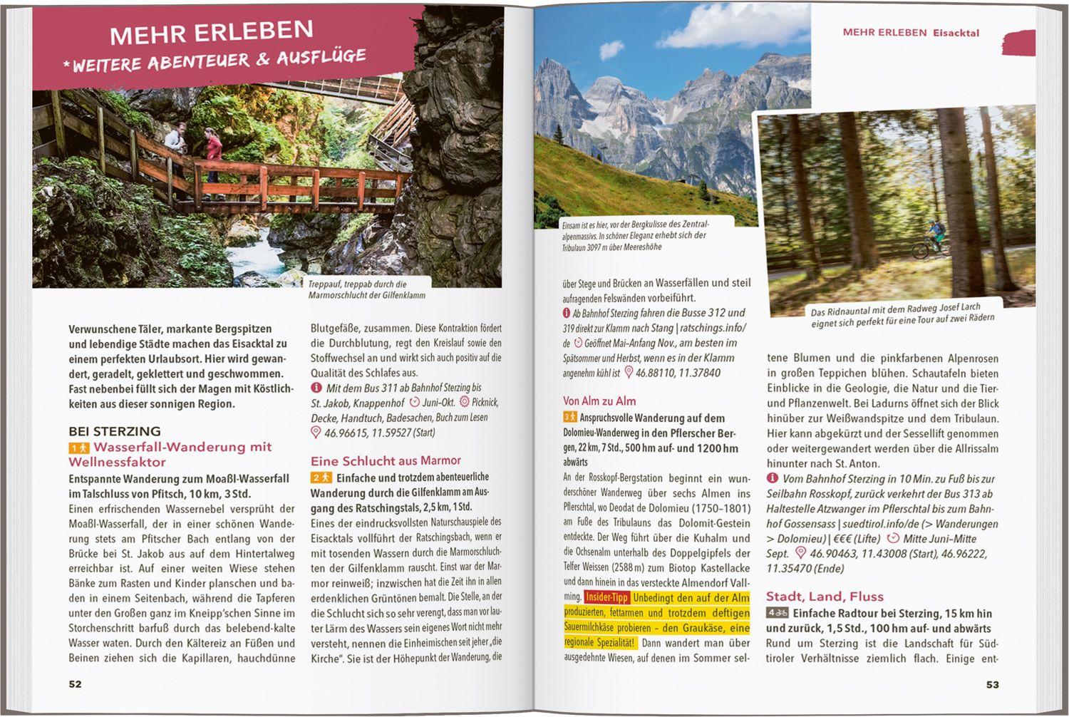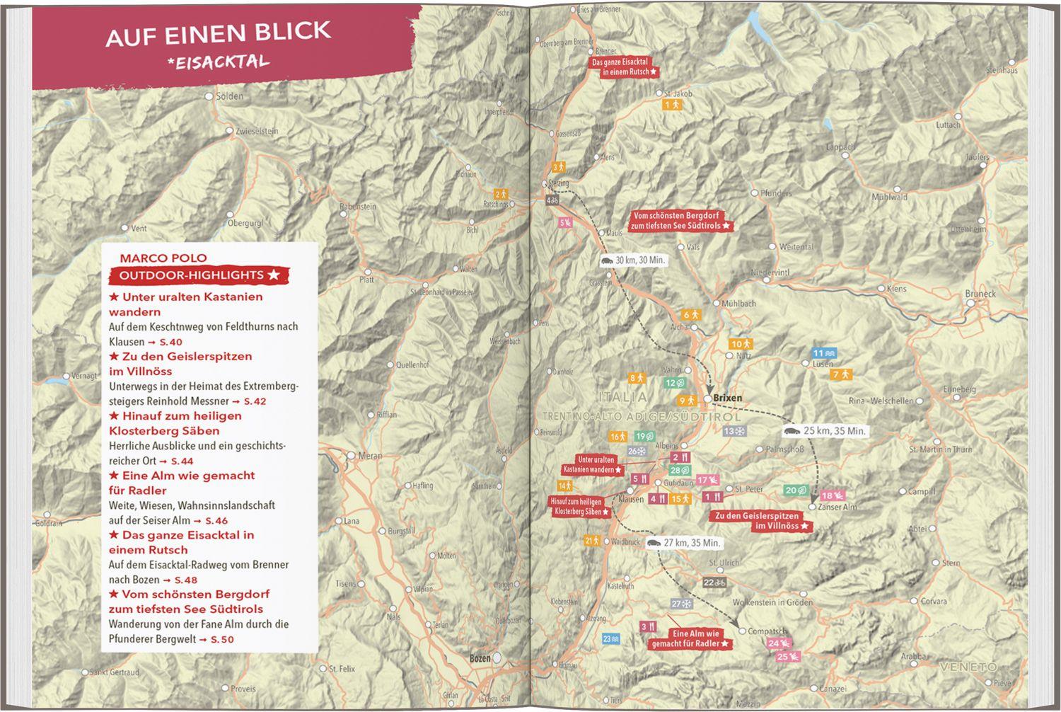 Durch Kastanienwälder und Weinberge streifen, eine Radtour im quirligen Bozen machen, durch Südtirols imposante Bergwelt wandern und sich einen Badetag an kristallklaren Bergseen gönnen: In Südtirol gibt es die unterschiedlichsten Abenteuer zu erleben! MARCO POLO Autorin Sylvia Pollex zog es aufgrund der Sehnsucht nach Natur vor einigen Jahren nach Südtirol. Seitdem erkundet sie jede Ecke ihrer neuen Heimat. Im MARCO POLO OUTDOOR GUIDE Reiseführer Südtirol verrät sie dir die schönsten Winkel ihrer Traumregion . Durchs Weinland radeln und auf die Kreuzwiesenalm wandern: Die vielen Facetten Südtirols Auch wenn die Region für die atemberaubende Drei Zinnen-Wanderung in den Dolomiten bekannt ist - Südtirol hat weit mehr zu bieten! Sylvia Pollex führt dich quer durch Vinschgau bis ins Pustertal und gibt dir Tipps für dein Outdoor-Abenteuer. Von einer der längsten Rodelabfahrten Europas bis zum Rafting: Dank der ausführlichen Beschreibungen im MARCO POLO OUTDOOR GUIDE Reiseführer Südtirol wird dein Urlaub zum Erlebnis !