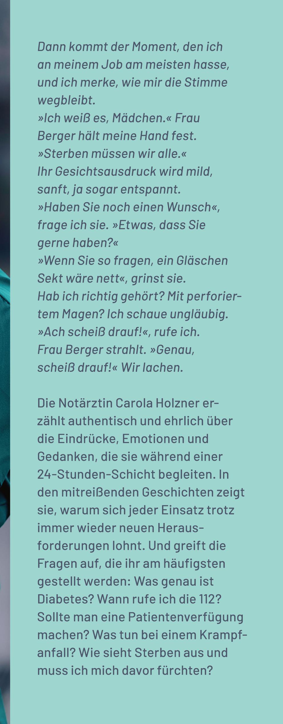 Sekunden entscheiden. Jeder Patient zählt.Carola Holzner ist als Notärztin im Einsatz und arbeitet als Oberärztin in der Notaufnahme. Nirgendwo sonst sind die Grenzen so schmal zwischen Glück und Unglück, Hoffnung und Verzweiflung, Leben und Tod. Sekunden entscheiden. Ein Herzschlag entscheidet. Carola Holzners Herz schlägt vor allem für ihre Patienten. Für sie ist sie unermüdlich im Einsatz, denn ihre Leidenschaft gilt der Akutmedizin. In ihrem Buch nimmt sie uns mit in ihre Welt zwischen Intensivstation, Schockraum und Straße. Sie gibt Einblicke, die fernab jeder Vorstellung liegen, was sich hinter verschlossenen Türen abspielt. Authentisch und ehrlich erzählt sie über die Emotionen und Gedanken, die sie während einer 24-Stunden-Schicht begleiten. Und die nicht eine Halbgöttin in Weiß zeigen, sondern den Menschen dahinter. Vor allem aber zeigen die Einblicke, dass Hoffnung und Wirklichkeit oft ziemlich weit auseinander liegen.Es sind aufrüttelnde, traurige, lustige, skurrile, teils verstörende, aber auch mutmachende Geschichten, die am Ende immer auch einen Mehrgewinn beim Lesen bieten, weil die Notärztin Carola Holzner die Fragen aufgreift, die ihr im Einsatz am häufigsten gestellt werden. Was genau ist Diabetes? Wann rufe ich die 112? Sollte man eine Patientenverfügung machen? Was tun bei einem Krampfanfall? Wie sieht Sterben aus?Carola Holzner, auch bekannt als Doc Caro, beantwortet diese und viele andere Fragen hilfreich und auf Augenhöhe.