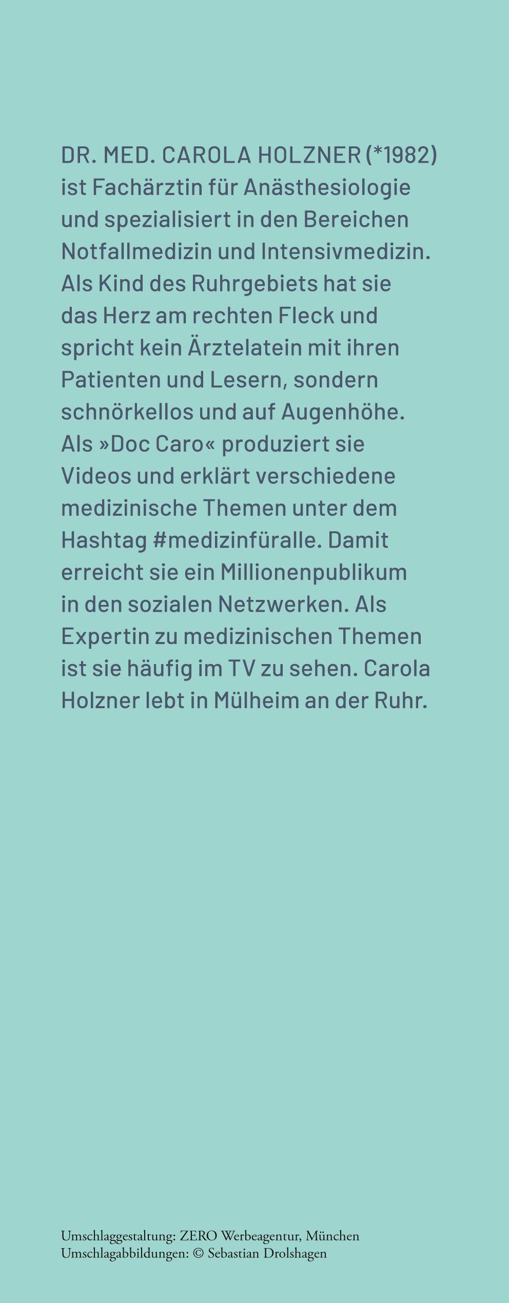 ?rztin zu werden und so Menschen zu helfen, war f?r Dr. med. Carola Holzner bereits ein Kindheitstraum. Die Fach?rztin f?r An?sthesiologie arbeitet als Ober?rztin in der Notaufnahme und als Not?rztin im Rettungsdienst.?Ihre Mission ist es, Medizin auf Augenh?he zu vermitteln. Deshalb steht Doc Caro zus?tzlich zu ihren zahlreichen Social-Media-Aktivit?ten mit gro?em Engagement als Expertin f?r medizinische Themen vor der Kamera. Carola Holzner lebt mit ihrer Familie in M?lheim an der Ruhr.