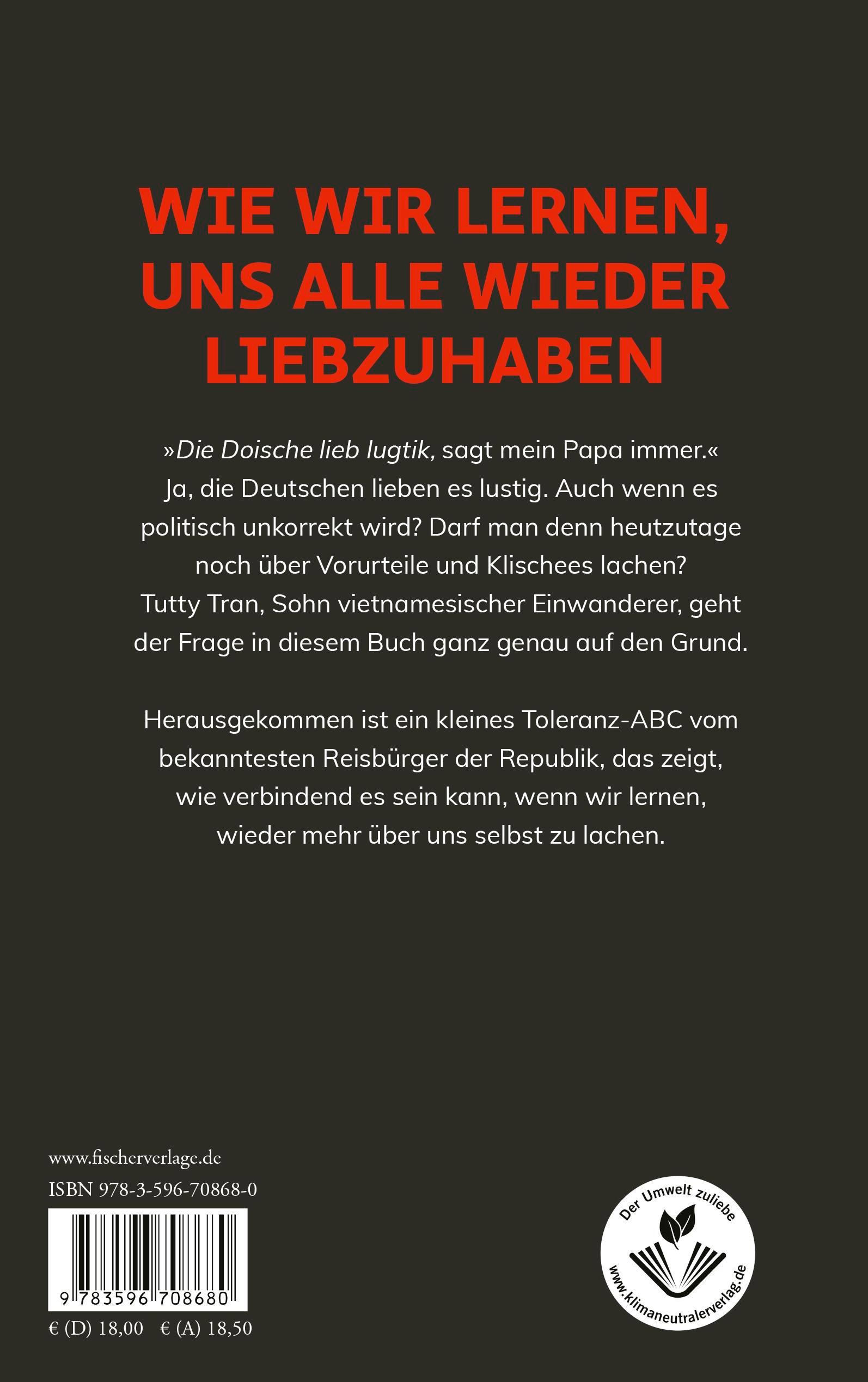 Wie wir lernen, uns alle wieder liebzuhaben: das erste Buch des preisgekrönten Stand-up-Comedians Tutty Tran "'Die Doische lieb lugtik', sagt mein Papa immer." Ja, die Deutschen lieben es lustig. Auch wenn es politisch unkorrekt wird? Darf man denn heutzutage noch über Vorurteile lachen? Tutty Tran, Sohn vietnamesischer Einwanderer, geht der Frage in diesem Buch ganz genau auf den Grund. Herausgekommen ist ein kleines Toleranz-ABC vom bekanntesten Reisbürger der Republik, das zeigt, wie verbindend es sein kann, wenn wir lernen, wieder mehr über uns selbst zu lachen.Schnelle Ratschläge gegen Vorurteile und Toleranzübungen für zu Hause inklusive