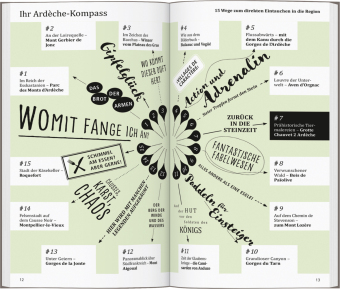 Dank vieler Tipps und Adressen erfahren Sie, wo es sich in fremden Betten gut schläft, wo Sie glücklich satt werden, wohin die Menschen an Ardèche und Tarn zum Stöbern und Entdecken gehen und wohin es sie zieht, wenn die Nacht beginnt.