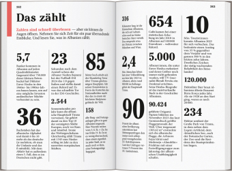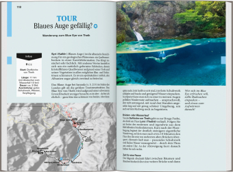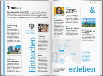 h und echt: Wir legen Wert auf ehrliche Erlebnisse, Nähe und Gegenwart Übersichtliche Gliederung in einzelne Regionen mit ihren Orten und Landschaften Lustvolle Eintauchen-und-erleben-Seiten vor jedem Kapitel Die Touren: Einfach losziehen, neue Wege gehen. Aktiv in Natur und Kultur eintauchen Die Lieblingsorte: gut für überraschende Entdeckungen Die Adressen: radikal subjektive Auswahl, mal stylish, mal ökologisch, immer individuell und persönlich Das Magazin: ein abwechslungsreiches Reisefeuilleton. Es packt auch kritische und kontroverse Themen an ... Die Karten: 8 Citypläne, 13 Tourenkarten, Übersichtskarte mit den Highlights Albaniens, Schnellüberblick zu jeder Region plus eine große Reisekarte