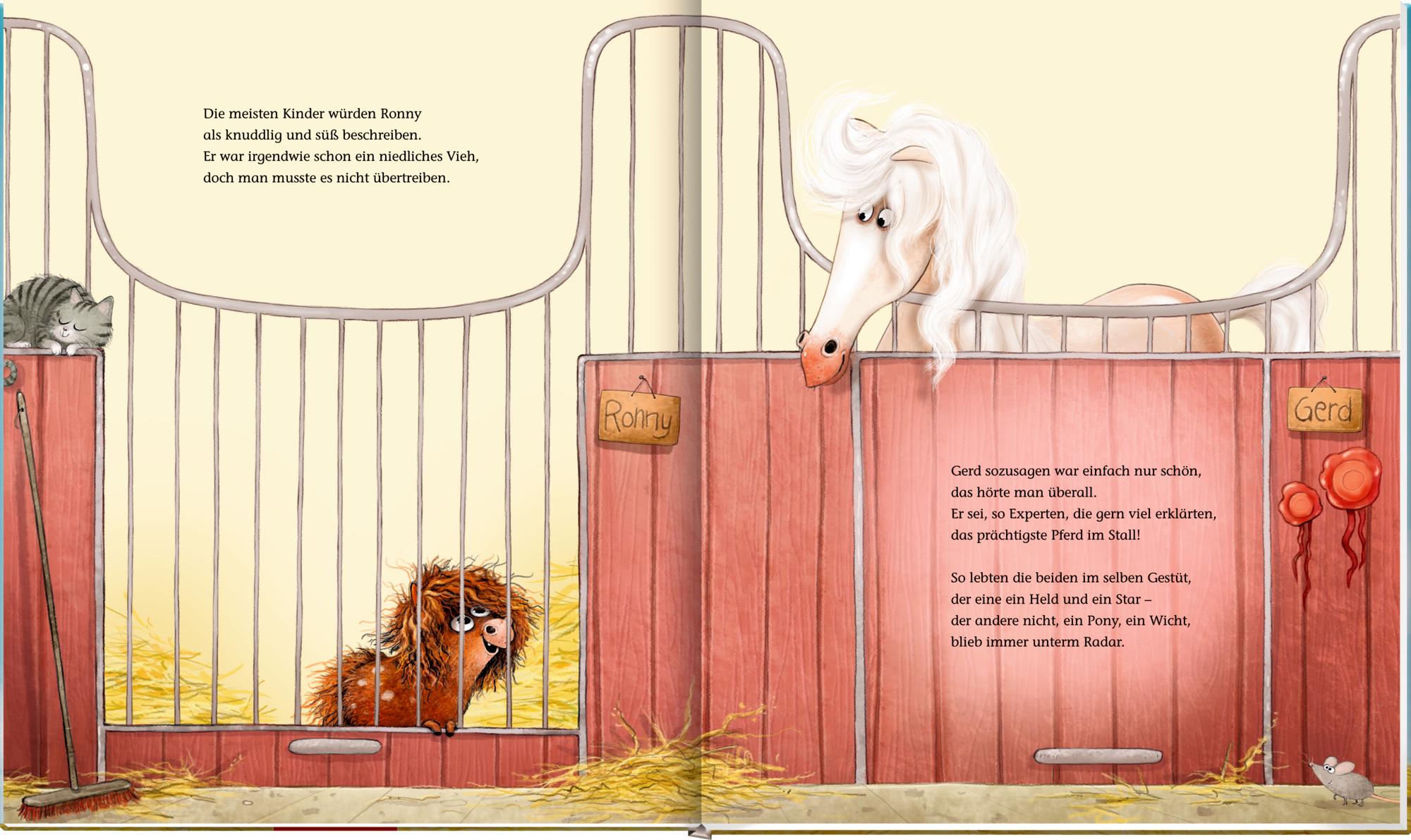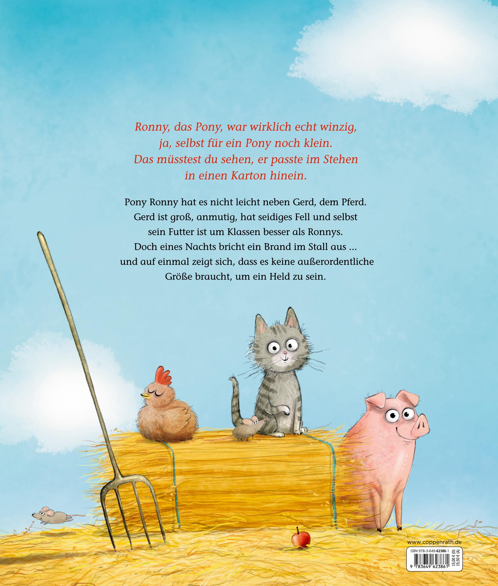 Pony Ronny hat es nicht leicht neben Gerd, dem Pferd. Gerd ist groß, galoppiert anmutig, hat seidiges Fell ... und selbst sein Futter ist um Klassen besser als Ronnys.Doch eines Nachts bricht ein Brand im Stall aus ... und auf einmal zeigt sich, dass es keine außerordentliche Größe braucht, um ein Held zu sein.