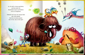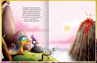 Und - BÖÖÖÖRPS!!! - zerreißt ein Rülpser die Stille. Hinter dem Vulkan steht ein großes felliges Etwas mit Stoßzähnen. Das ist Rüdiger Rülps-Rüssel und er hat Hunger. Gewaltigen Hunger!