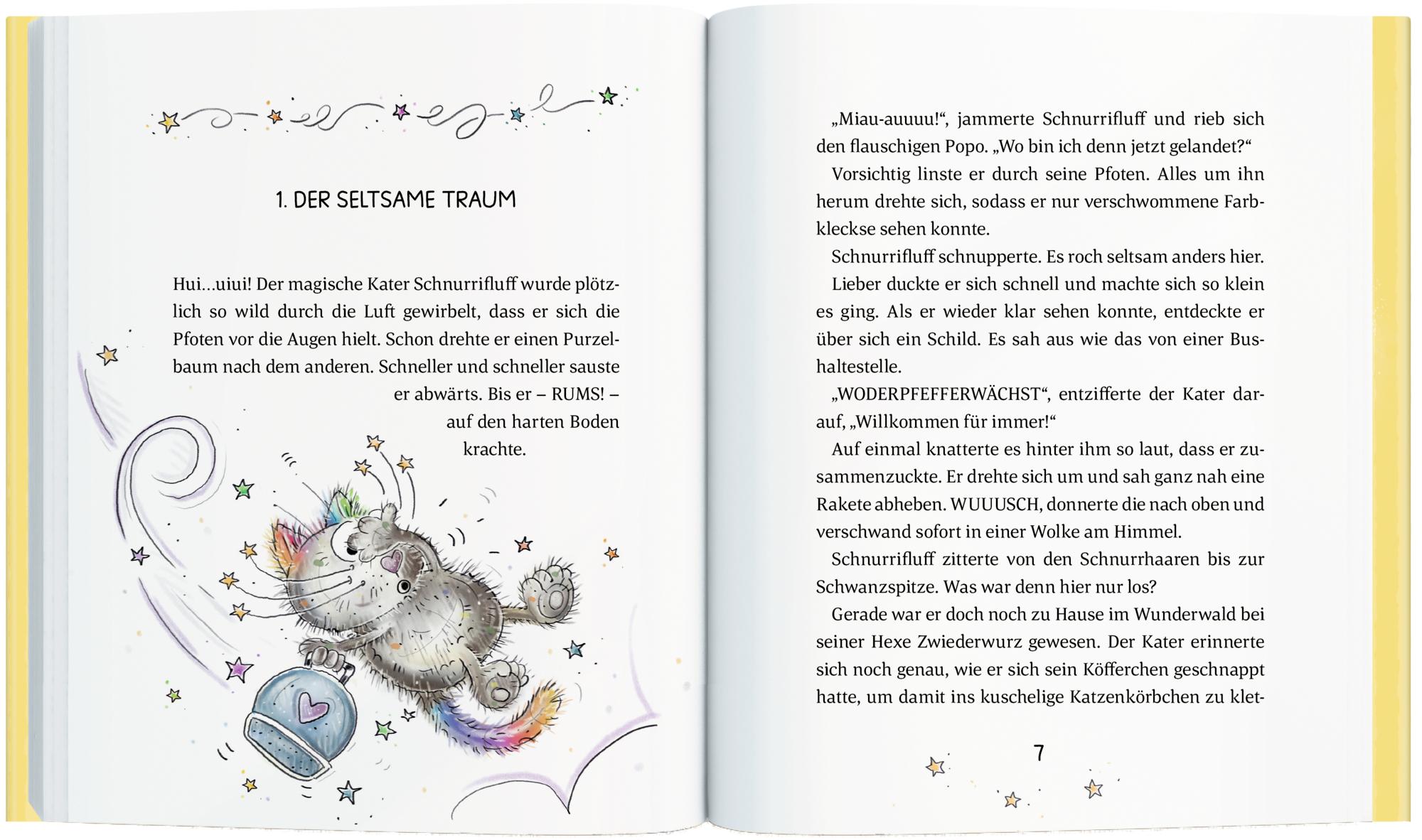 Mit einem Schreck bis in die Schnurrhaarspitzen findet sich der magische Kater Schnurrifluff plötzlich in einer seltsamen Welt wieder: WODERPFEFFERWÄCHST. Wie ist er bloß hier gelandet, weit weg von der Hexe Zwiederwurz und seinem kuscheligen Katzenkörbchen?Schnurrifluff will nur eines: so schnell wie möglich wieder nach Hause! Doch beim Versuch, sich zurückzuzaubern, passieren ihm lauter lustige Missgeschicke. Zum Glück trifft er bald auf den schlagfertigen Vogel Papperlapapp und die süße Pfefferkuchenschnecke Snelli. Ob sie gemeinsam einen Weg zurück in den Wunderwald finden? Ein zauberhaftes Kinderbuch zum Vorlesen und Träumen!