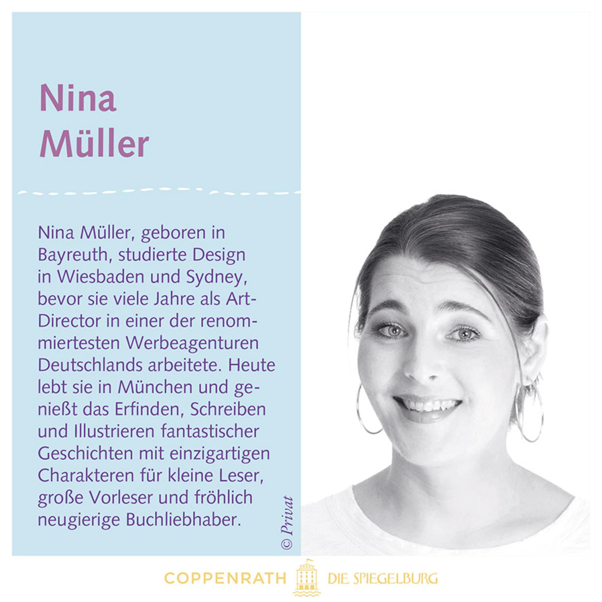 Nina Müller, geboren in Bayreuth, studierte Design in Wiesbaden und Sydney, bevor sie viele Jahre als Art-Director in einer der renommiertesten Werbeagenturen Deutschlands arbeitete. Heute lebt sie in München und genießt das Erfinden, Schreiben und Illustrieren fantastischer Geschichten mit einzigartigen Charakteren für kleine Leser, große Vorleser und fröhlich neugierige Buchliebhaber.