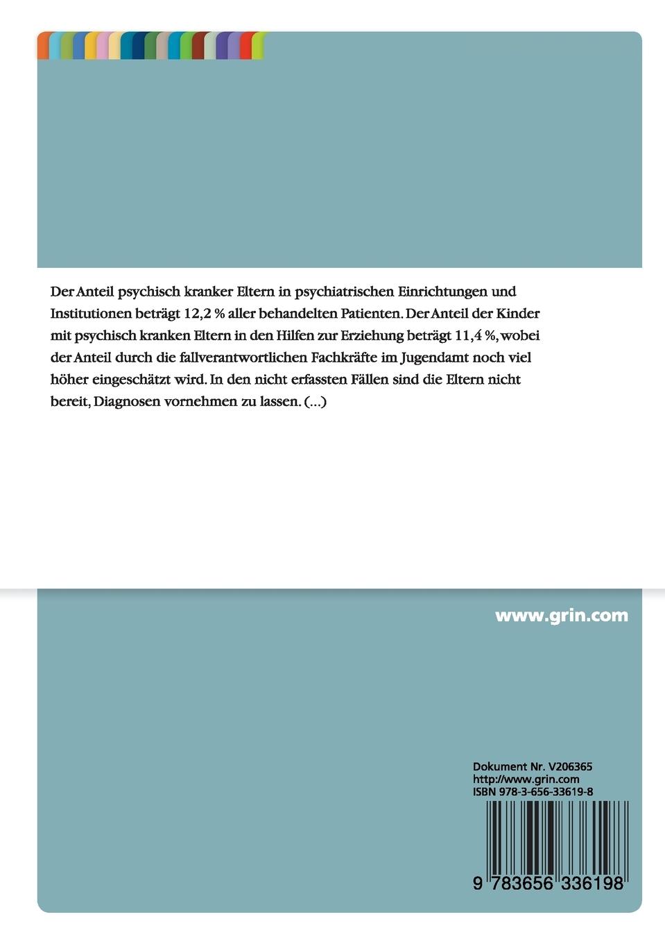 Studienarbeit aus dem Jahr 2012 im Fachbereich Sozialpädagogik / Sozialarbeit, Note: 2,0, Frankfurt University of Applied Sciences, ehem. Fachhochschule Frankfurt am Main (Soziale Arbeit), Veranstaltung: Modul 14 - Vertiefungsmodul Gesellschaft und Persönlichkeit, Sprache: Deutsch, Abstract: Der Anteil psychisch kranker Eltern in psychiatrischen Einrichtungen und Institutionen beträgt 12,2 % aller behandelten Patienten. Der Anteil der Kinder mit psychisch kranken Eltern in den Hilfen zur Erziehung beträgt 11,4 %, wobei der Anteil durch die fallverantwortlichen Fachkräfte im Jugendamt noch viel höher eingeschätzt wird. In den nicht erfassten Fällen sind die Eltern nicht bereit, Diagnosen vornehmen zu lassen. Diese Zahlen machen deutlich, dass Kinder psychisch kranker Eltern nicht nur eine große Zielgruppe der Kinder- und Jugendhilfe sind, sondern psychisch kranke Eltern auch eine relativ große Gruppe in psychiatrischen Einrichtungen und Institutionen darstellen. In dieser Arbeit soll es darum gehen, welche Auswir-kungen psychische Erkrankungen der Eltern auf die Erziehungsfähigkeit und die Entwicklung der Kinder haben. Der Blick wird anschließend auf die Hilfemöglichkeiten und Kooperationsanforderungen der Psychiatrie und des Jugendamtes, als die wichtigen und relevanten Institutionen in Hinblick auf die Zusammenarbeit mit psychisch kranken Eltern und deren Kinder, gerichtet.