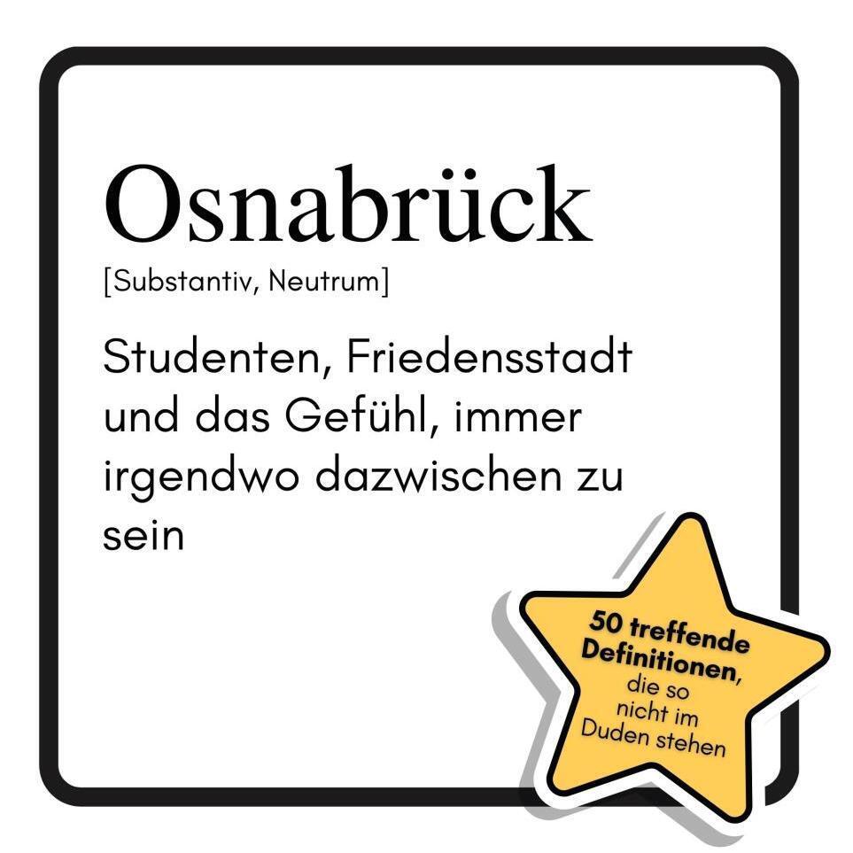 Osnabrück - wo Studierende, Friedensbotschafter und Regenradler aufeinandertreffen und das Gefühl, immer irgendwo dazwischen zu sein, zum Lebensgefühl wird. "Osnabrück: Studenten, Friedensstadt und das Gefühl, immer irgendwo dazwischen zu sein" nimmt die Stadt mit 50 witzigen Definitionen und charmanten Illustrationen liebevoll auseinander. Von Schlossgarten bis Piesberg, von Maiwoche bis Nullfünfvierzehn - hier wird Osnabrück so beschrieben, wie es wirklich ist: ein Ort voller Gegensätze, Geschichten und einer Prise Selbstironie.Für wen dieses Buch optimal geeignet ist:- Für Osnabrücker, die ihre Stadt mit einem Augenzwinkern sehen wollen- Für Studierende, Zugezogene und Heimkehrer- Für alle, die urbane Eigenheiten und Lokalkolorit liebenEin Buch, das Osnabrück in 50 humorvollen Momentaufnahmen einfängt und dabei zeigt, warum das Dazwischen hier zum Markenzeichen wird.Was beim Kauf dieses Buches erwartet werden kann:- 50 lustige Definitionen rund um Osnabrück- Passende Illustrationen zu jedem Eintrag- Lokaler Humor und Wiedererkennungswert- Ein originelles Geschenk für Osnabrück-Fans