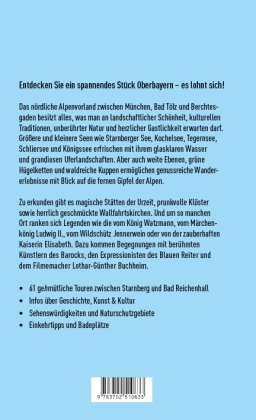 Ein spannendes Stück BayernDas nördliche Alpenvorland zwischen München, Bad Tölz und Berchtesgaden besitzt alles, was man an landschaftlicher Schönheit, kulturellen Traditionen, unberührter Natur und herzlicher Gastlichkeit erwarten darf. Größere und kleinere Seen wie Starnberger See, Kochelsee, Tegernsee, Schliersee und Königssee erfrischen mit ihrem glasklaren Wasser und grandiosen Uferland-schaften. Aber auch weite Ebenen, grüne Hügelketten und waldreiche Kuppen ermöglichen genussreiche Wandererlebnisse mit Blick auf die fernen Gipfel der Alpen.Zu erkunden gibt es magische Stätten der Urzeit, prunkvolle Klöster sowie herrlich geschmückte Wallfahrtskirchen. Und um so manchen Ort ranken sich Legenden wie die vom König Watzmann, vom Märchenkönig Ludwig II., vom Wildschütz Jennerwein oder von der zauberhaften Kaiserin Elisabeth. Dazu kommen Begegnungen mit berühmten Künstlern des Barock, den Expressionisten des Blauen Reiters und dem Filmemacher Lothar-Günther Buchheim.Entdecken Si
