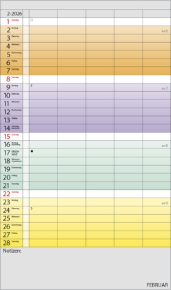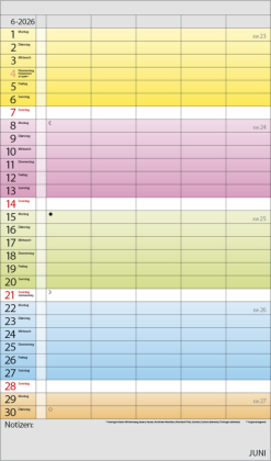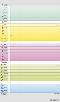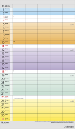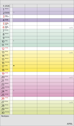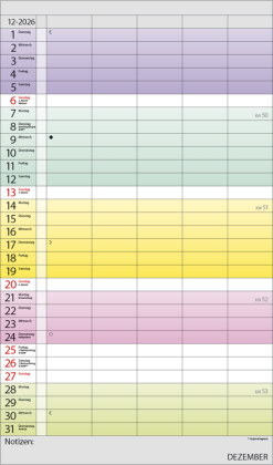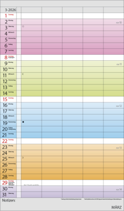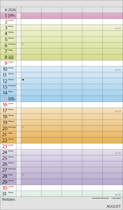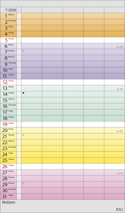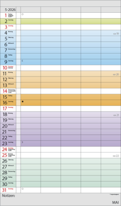 Hinzu kommen farblich hervorgehobene Sonn- und Feiertage, sowie die Anzeige der Zeitumstellung, damit kein Termin mehr übersehen wird. Weitere Informationen wie Mondphasen, Ferientermine und Feiertage (auch regionale) sowie deutlich lesbare Kalenderwochen runden den Kalender ab und sorgen für einen vollständigen Überblick Ihres Jahres.