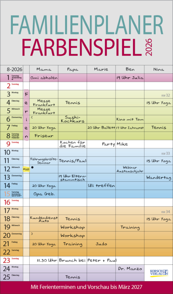 Übersichtlicher Familienplaner für bis zu 5 Personen; sehr stabile Rückwand; 27 x 46 cm Praktische Zusatzspalte für Ferien, Müll und weitere Aktivitäten Wöchentlich wechselnde moderne Farben mit viel Platz für Eintragungen, ohne störende Bilder in den Spalten Dickes, umweltfreundliches FSC Papier; leichte Beschreibbarkeit, auch mit Bunt- und Bleistiften Deutsches Kalendarium mit regionalen Feiertagen für Deutschland, Österreich und Schweiz Farblich hervorgehobene Sonn- und Feiertage, sowie Anzeige der Zeitumstellung