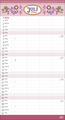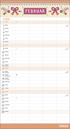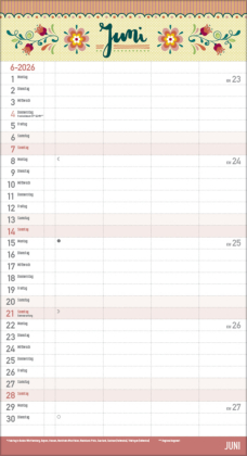 Dekorativer Familientimer im angesagten Vintage-Stil - mit vielen Details liebevoll gestaltet von Mo Büdinger. Mit vier Spalten zum Eintragen von Geburtstagen, Terminen und Erinnerungen bietet der Planer viel Platz für Notizen. Damit ist es auch möglich mehrere Termine in einen Tag zu schreiben. Der Organisation des Alltags von großen und kleinen Familien steht somit nix mehr im W