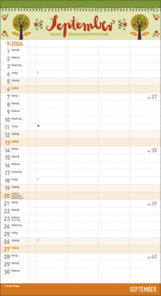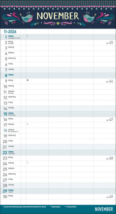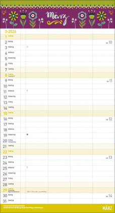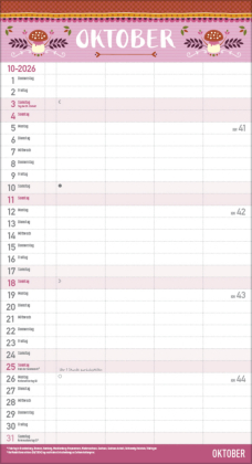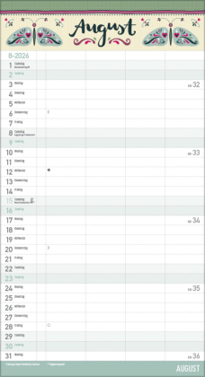 Weitere Informationen wie Mondphasen, Ferientermine und Feiertage (auch regionale) sowie deutlich lesbare Kalenderwochen runden den Kalender ab und sorgen für einen vollständigen Überblick Ihres Jahres.