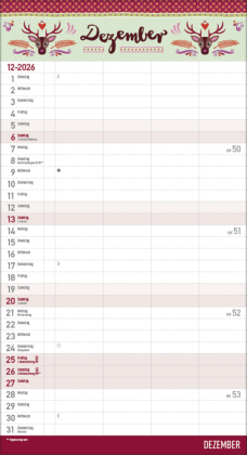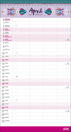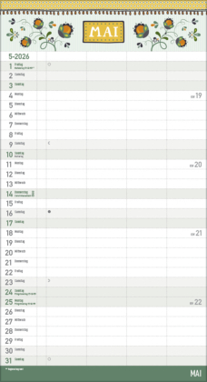 Übersichtlicher Familienplaner für bis zu 4 Personen; sehr stabile Rückwand Praktische Zusatzspalte für Ferien, Müll und weitere Aktivitäten Terminplaner ohne störende Bilder in den Spalten; Viel Platz für Eintragungen, leichte Beschreibbarkeit, auch mit Bunt- und Bleistiften Deutsches Kalendarium mit regionalen Feiertagen für Deutschland, Österreich und Schweiz Gedruckt auf umweltfreundlichem FSC Papier