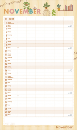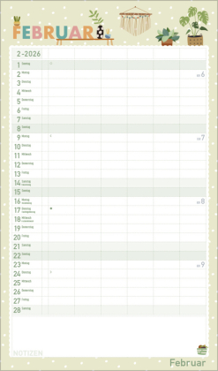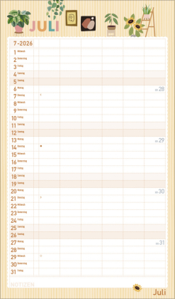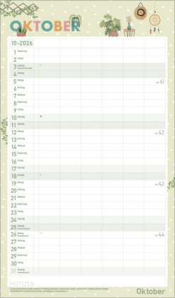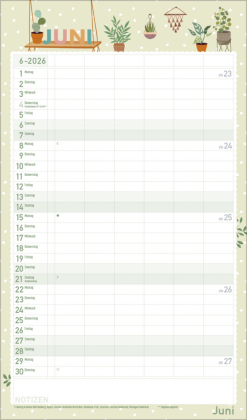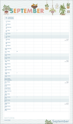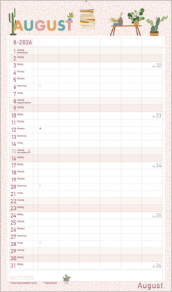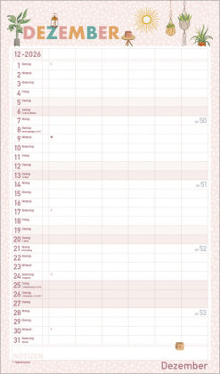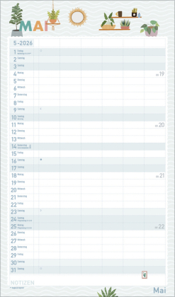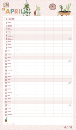 Urban Jungle und Zimmerpflanzen liegen voll im Trend. In seinen fröhlichen und pastellig-zarten Illustrationen im nach wie vor angesagten Flat Design greift dieser Familienplaner diesen Trend auf und zaubert mit seinen vielen Details eine liebevolle Wohlfühl-Atmosphäre an die Wand. Mit sechs großen Spalten sowie Ferienterminen und Vorschau fürs Folgejahr.