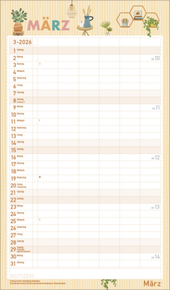 Übersichtlicher Familienplaner mit 6 großen Spalten; sehr stabile Rückwand; 27 x 46 cm Terminkalender mit viel Platz für Eintragungen, ohne störende Bilder in den Spalten leichte Beschreibbarkeit, auch mit Bunt- und Bleistiften Deutsches Kalendarium mit regionalen Feiertagen für Deutschland, Österreich und Schweiz Farblich hervorgehobene Sonn- und Feiertage, sowie Anzeige der Zeitumstellung Gedruckt auf dickem und umweltfreundlichem FSC Papier