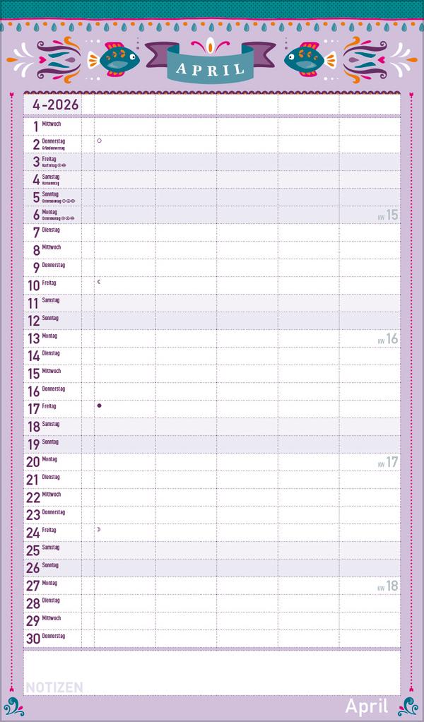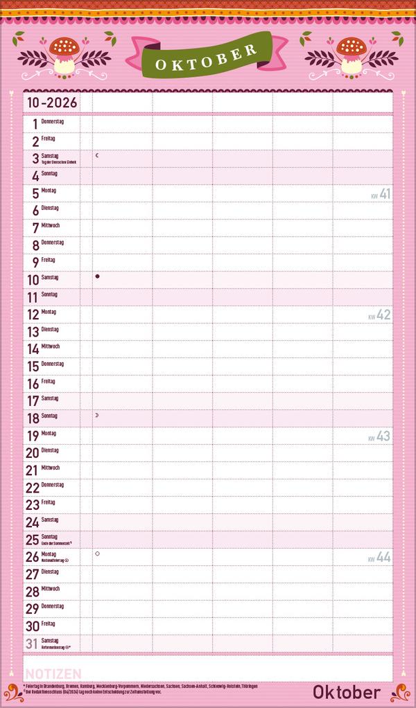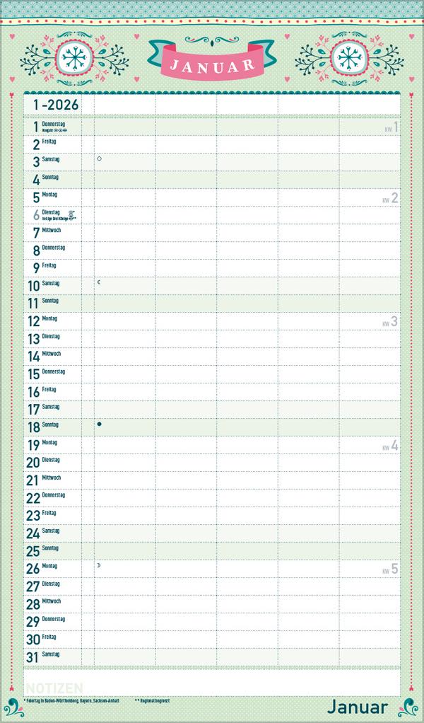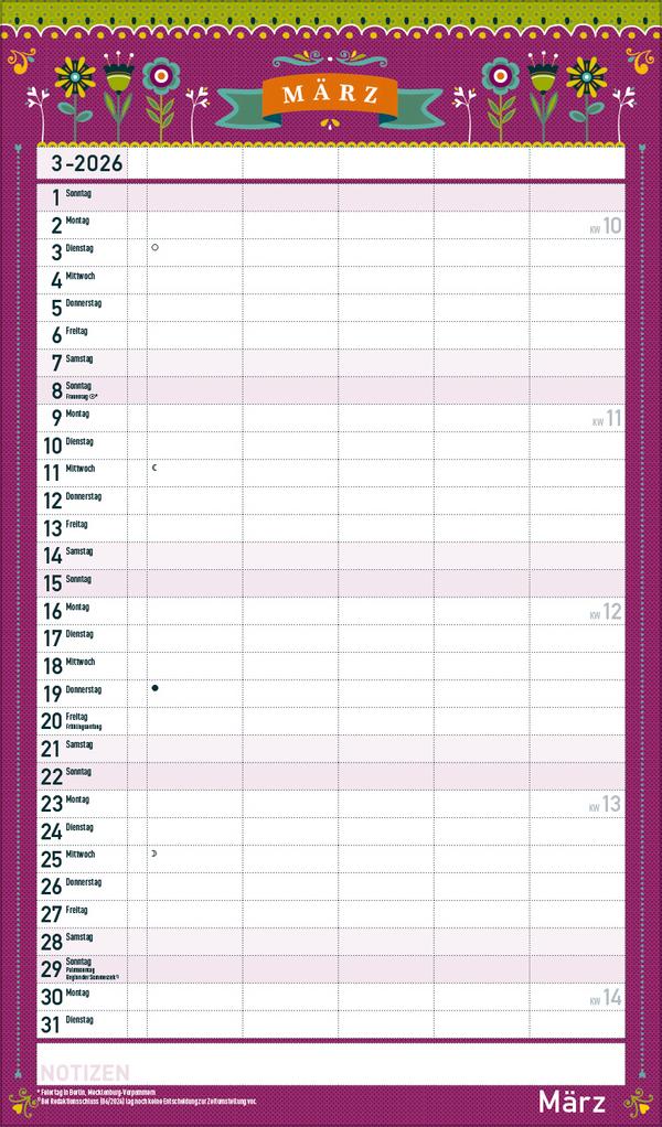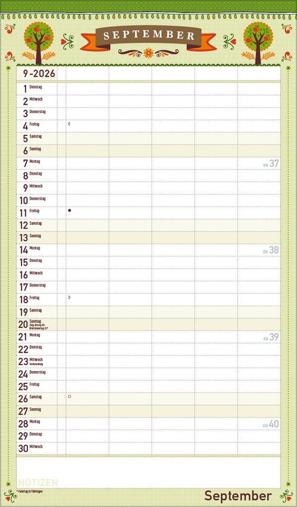 Dekorativer Familientimer im angesagten Vintage-Stil - mit vielen Details liebevoll gestaltet von Mo Büdinger. Mit fünf Spalten zum Eintragen von Geburtstagen, Terminen und Erinnerungen bietet der Multiplaner viel Platz für Notizen. Damit ist es auch möglich mehrere Termine in einen Tag zu schreiben. Der Organisation des Alltags von großen und kleinen Familien steht somit nix mehr im Weg. Neben dem gesamten Kalenderjahr enthält der Wandplaner auch eine Vorschau bis März des Folgejahres.Weitere Informationen wie Mondphasen, Ferientermine und Feiertage (auch regionale) sowie deutlich lesbare Kalenderwochen runden den Kalender ab und sorgen für einen vollständigen Überblick Ihres Jahres.