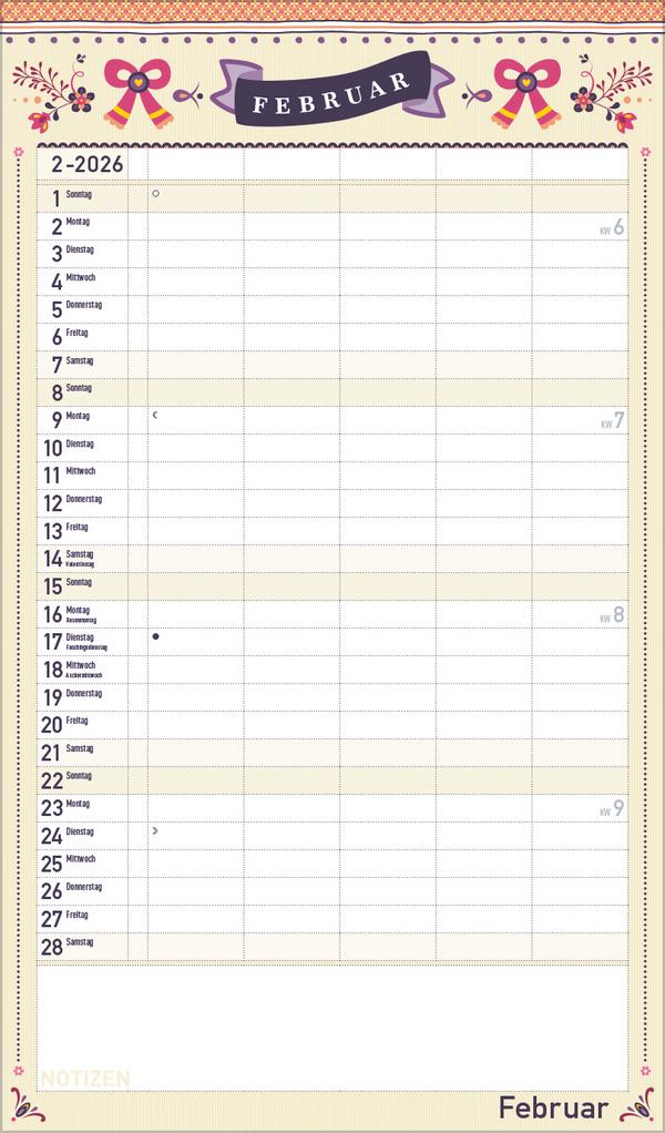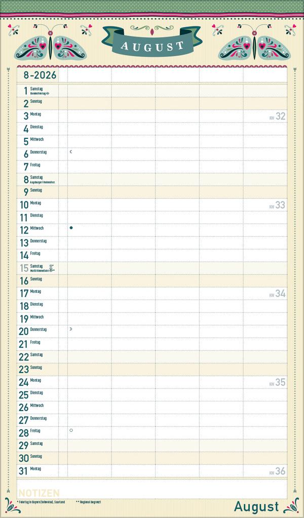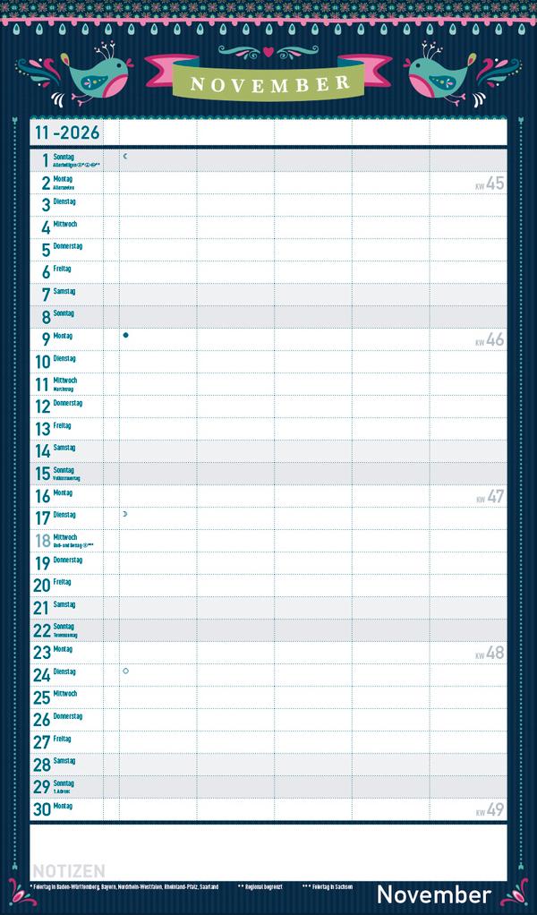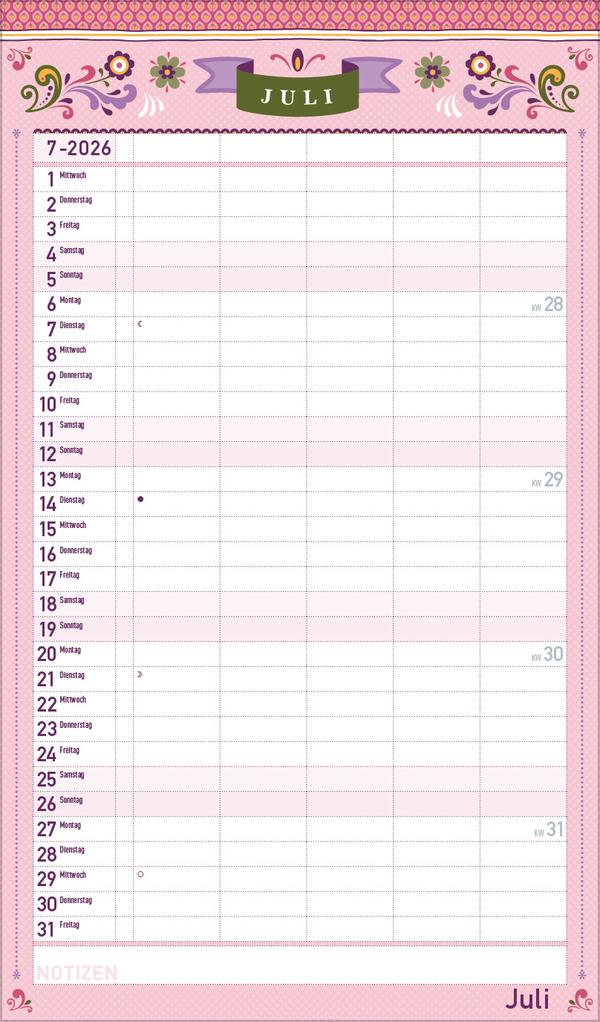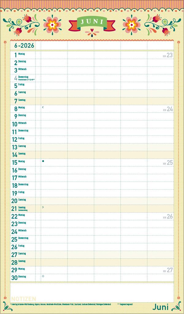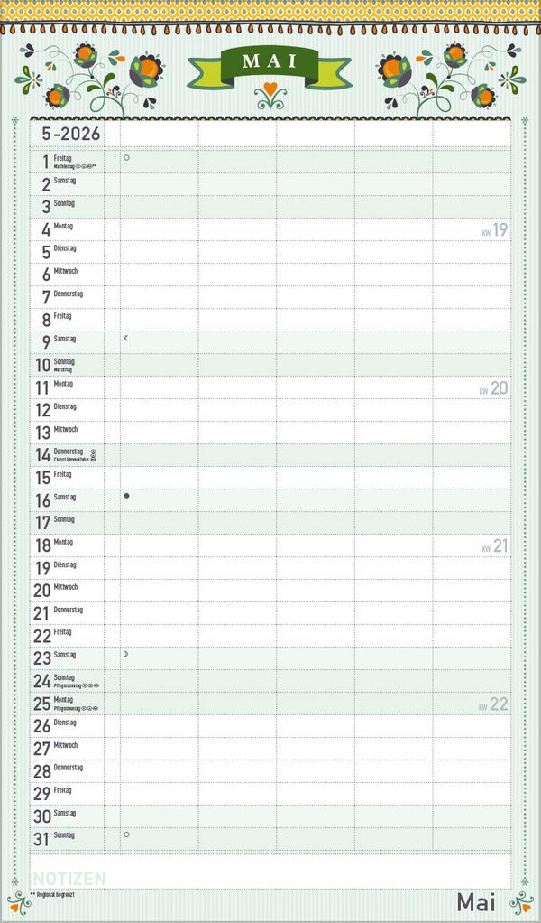 Dekorativer Familientimer im angesagten Vintage-Stil - mit vielen Details liebevoll gestaltet von Mo Büdinger. Mit fünf Spalten zum Eintragen von Geburtstagen, Terminen und Erinnerungen bietet der Multiplaner viel Platz für Notizen. Damit ist es auch möglich mehrere Termine in einen Tag zu schreiben. Der Organisation des Alltags von großen und kleinen Familien steht somit nix mehr im Weg. Neben dem gesamten Kalenderjahr enthält der Wandplaner auch eine Vorschau bis März des Folgejahres.Weitere Informationen wie Mondphasen, Ferientermine und Feiertage (auch regionale) sowie deutlich lesbare Kalenderwochen runden den Kalender ab und sorgen für einen vollständigen Überblick Ihres Jahres.