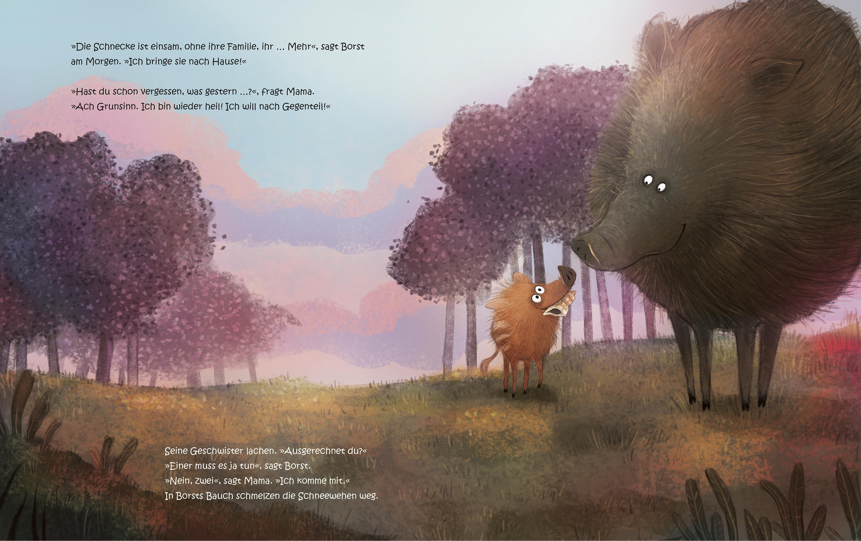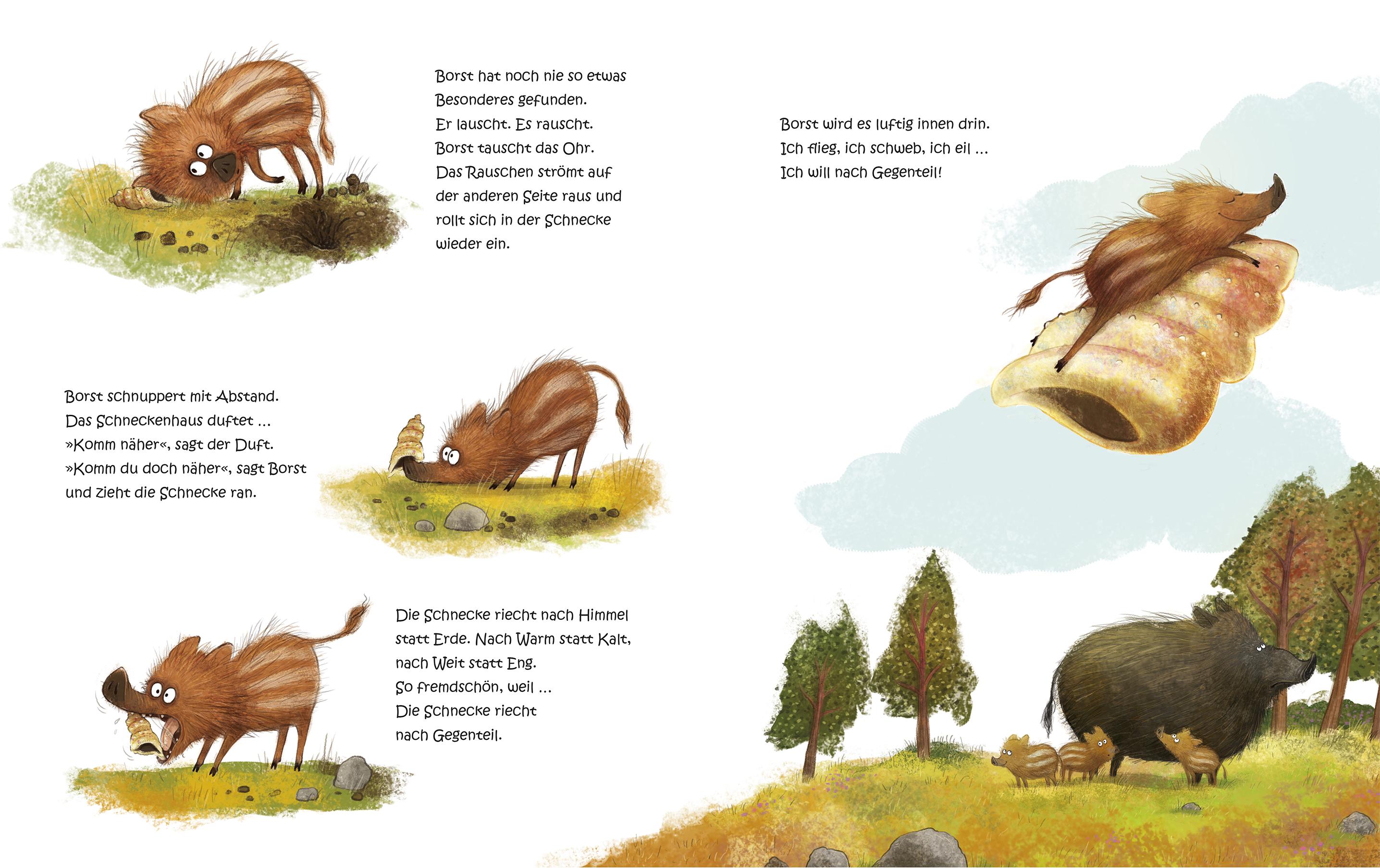 Eines Tages findet Frischling Borst eine Meeresschnecke im Wald. Die duftet so wunderbar nach Gegenteil. Unbedingt will Borst die Schnecke nach Hause bringen. Aber der Weg zum Meer ist weit und gefährlich ...Eine poetische Bilderbuchgeschichte, die davon erzählt, dass auch ein kleines Wildschwein das Meer erreichen kann, wenn es nur wirklich will.