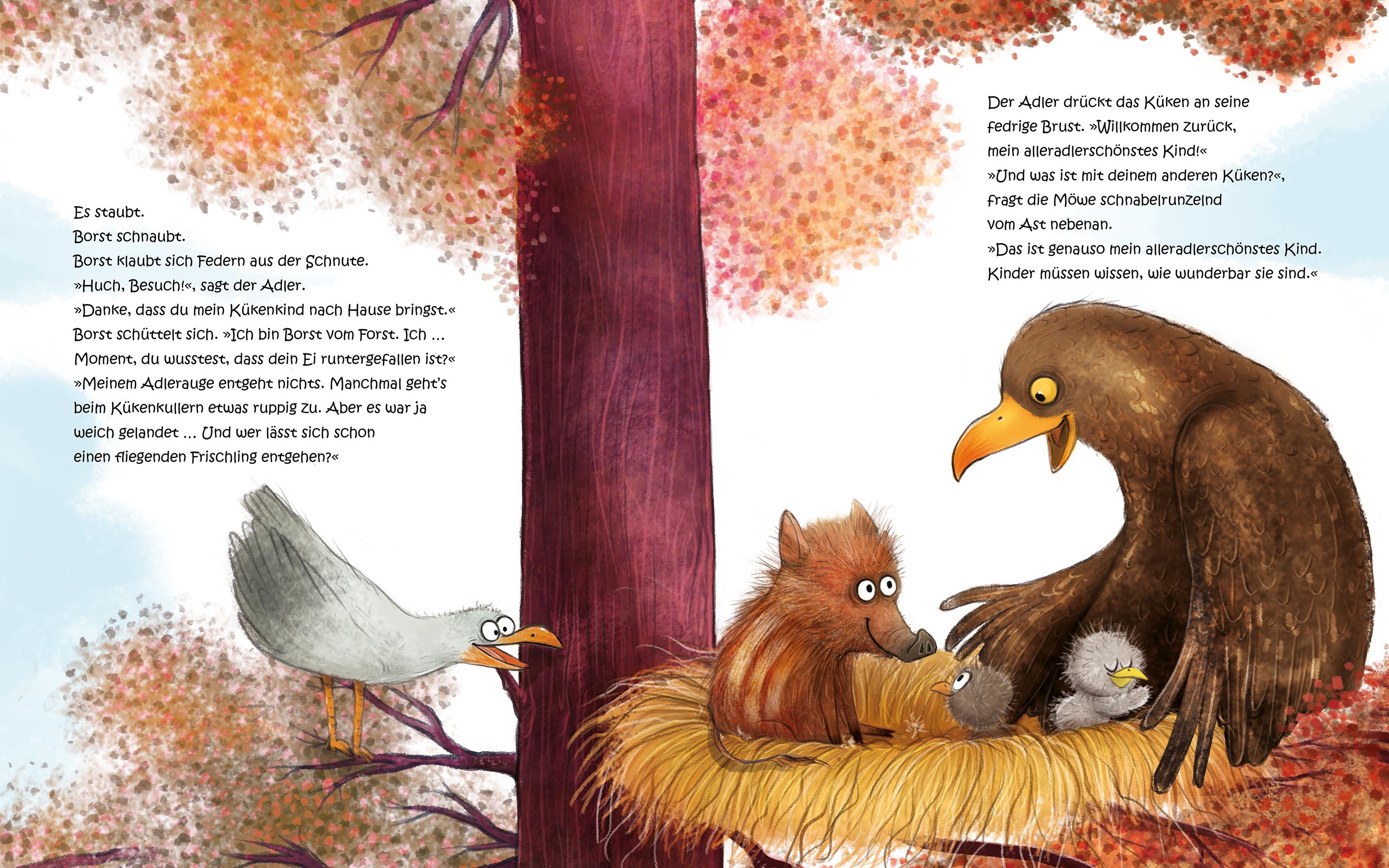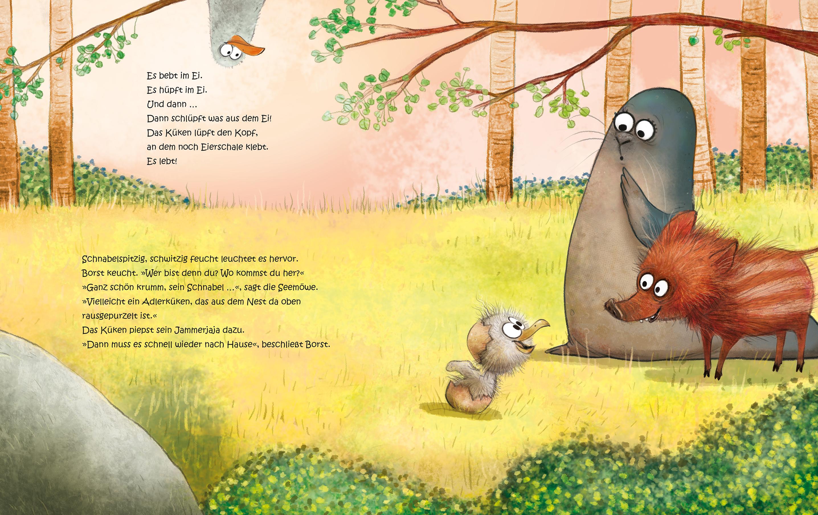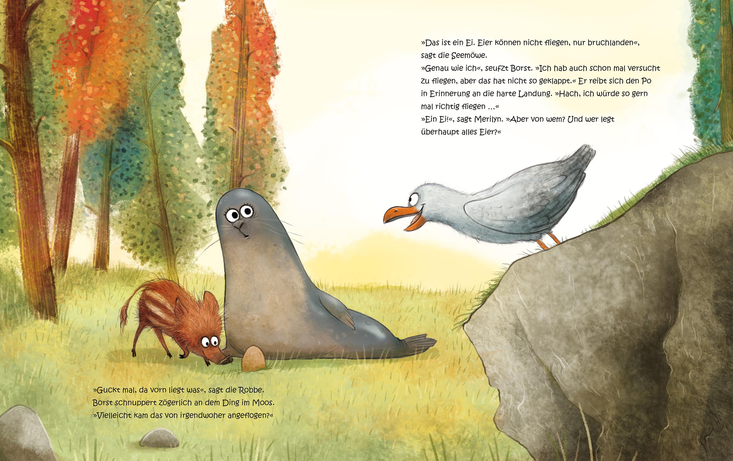 Borst, die Robbe Merilyn und die Seemöwe finden ein Ei. Doch wo kommt es her und wie kommt es dahin zurück? Und - huch! - was passiert denn da? Es bebt im Ei. Es hüpft im Ei. Und dann ... Dann schlüpft was aus dem Ei! So macht sich Frischling Borst auf, das Küken sicher nach Hause zu bringen - und die Welt zum allerersten Mal von ganz hoch oben zu betrachten. Der langersehnte zweite Band von Borst vom Forst - ein neues witzig-poetisches Bilderbuch-Abenteuer, wieder genial illustriert von Wiebke Rauers!
