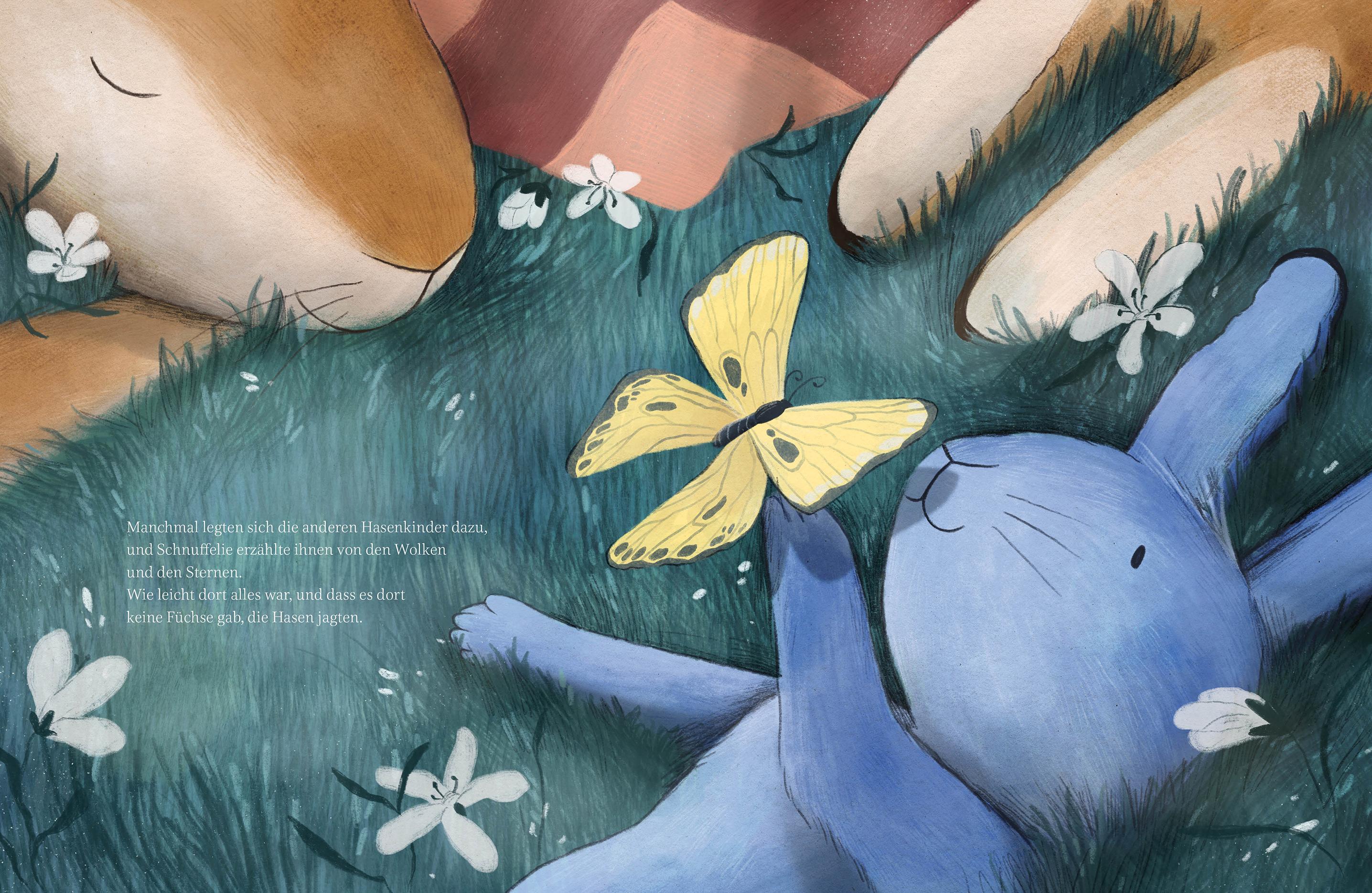 In einer warmen Sommernacht bekommt Familie Hase Zuwachs. Mutter Hase sieht es sofort: dieses Baby ist etwas ganz Besonderes. Es ist so zart, blau wie der Himmel und das kleine Baby schläft viel und träumt. Wunderschöne Träume. In ihren Träumen schwebt Schnuffelie im Himmel umher und sammelt das Funkeln von Sternen oder ein Stück weiche Wolke zum Kuscheln. Die ganze Familie kümmert sich rührend um ihr kleines, besonderes Baby. Die Eltern genießen jeden Moment mit ihrem zarten Geschöpf und eines Tages wachsen Schnuffelie wirklich Flügel. Aber die Erinnerungen an sie bleiben. – Mit dem Verlust eines geliebten Menschen gerät die Welt aus den Fugen. Die Bewältigung von Trauer braucht ihren Platz, und dieses Buch zeigt einen Weg auf, gemeinsam Erinnerungen zu erschaffen, um als Familie mit dem Verlust umzugehen. Wunderschön geschrieben lädt das Buch ein, sich mit der Trauer auseinanderzusetzen und Gefühle zuzulassen. Die Illustrationen veranschaulichen auf einfühlsame Weise, was zählt und bleibt.