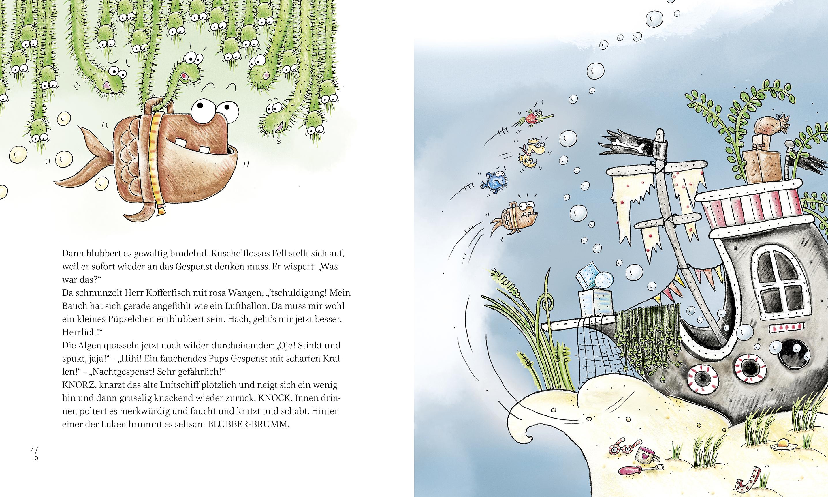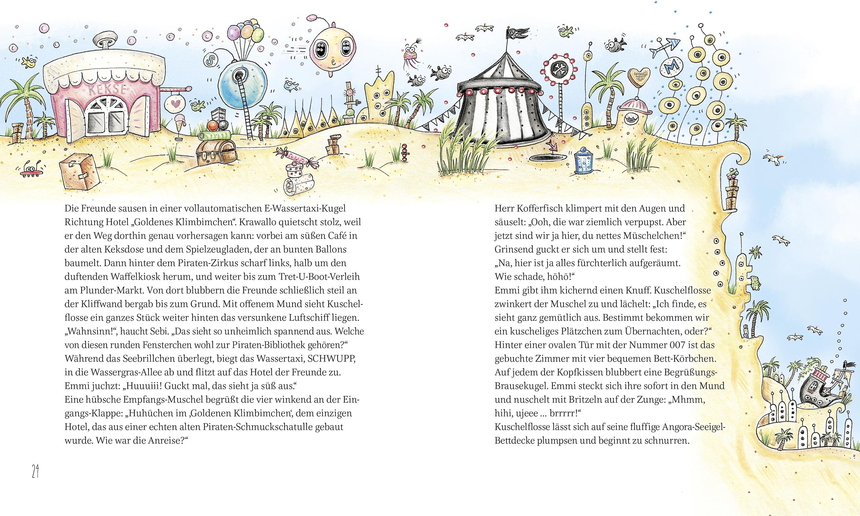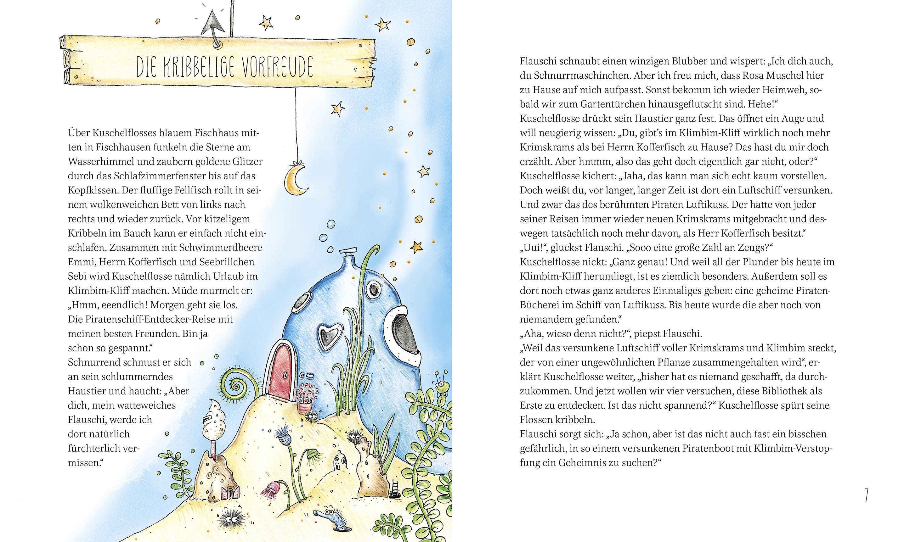 Kuschelflosse und seine Freunde sind schon ganz aufgeregt: Morgen geht es endlich in den Urlaub! Von Fischhausen wollen sie mit dem Nachtblubberzug zum Klimbim-Kliff fahren. Ein paar spannende Tage liegen vor ihnen: Kuschelflosse möchte unbedingt mit den einzigartigen Schmuse-Algen kuscheln, Emmi durch den turbulenten Klimbim-Kliff-Tunnel sausen, Herr Kofferfisch entspannt Klimbim-Wellness machen, und Sebi in einem versunkenen Luftschiff nach der sagenumwobenen Piraten-Bibliothek suchen. Doch dann hört Kuschelflosse im Radio, dass es im Klimbim-Kliff neuerdings spuken soll. Ob da etwas Wahres dran ist?
