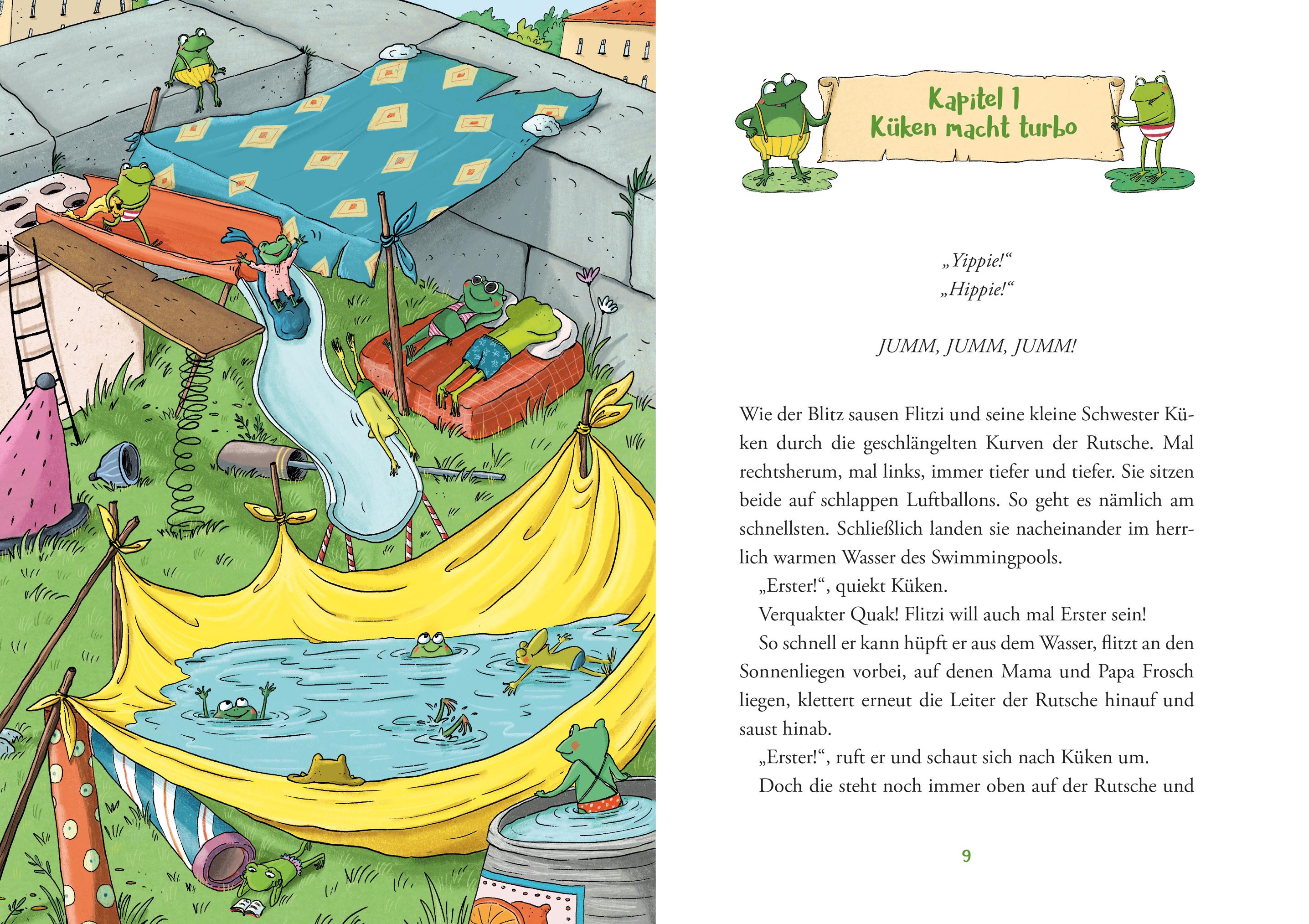 Das Leben der Froschfamilie könnte nicht schöner sein. Sie leben in der Stadt auf einem Hochhausdach und genießen den Sommer in vollen Zügen. Doch plötzlich wird Küken, die kleine Schwester von Fauli und Flitzi, so durch die Luft gewirbelt, dass sie auf einem komischen Vogel landet. Und schwups, ist sie weg. Die beiden Frösche machen sich sofort auf die Suche nach Küken. Dabei lernen sie die verschiedensten Tiere kennen. So helfen sie einem Igel, der in einer Schlange feststeckt, und sie bringen zwei Fische wieder zusammen, die sich nach dem Versteckspiel nicht mehr gefunden haben. Am Ende finden sie Küken. Doch können sie ihr aus ihrer verzwickten Lage helfen? Oder wird sie am Ende doch noch von dem Flattermax, der sich als Storch entpuppt, gefressen? – Eine lustige und vielseitige Geschichte zweier Froschbrüder, die zuvor ihr Hochhausdach nie verlassen haben. Sie lernen die Welt mit all ihren Tieren kennen. Lustig sind u.a. die Namen, die sie sich für die Tiere überlegen. So sind zwei Kaninchen die Ohrenflitzer und die Eule ist das Federwesen. Die beiden haben eine herrlich pragmatische Sicht auf die Dinge. Das Buch kann man sehr empfehlen – sowohl als Vorlesebuch als auch für Kinder ab 8 Jahren zum Selberlesen.