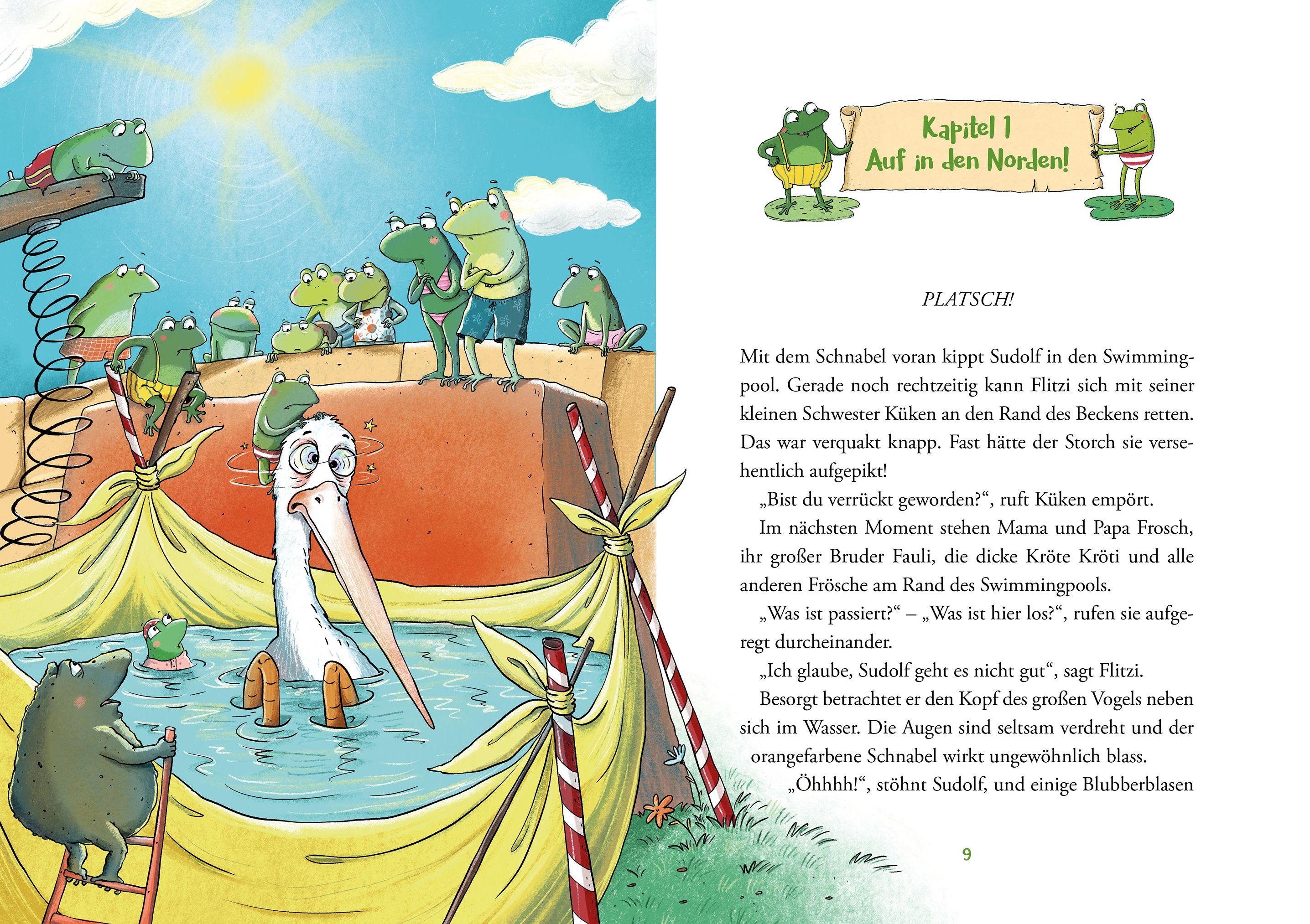 Im Sommer kann es auf dem höchsten Dach einer großen Stadt schon mal ziemlich heiß werden. Zu heiß für den Storch Sudolf, der dort zusammen mit seinen Froschfreunden lebt. Kurzerhand beschließt er, zur Abkühlung in den Norden zu fliegen.