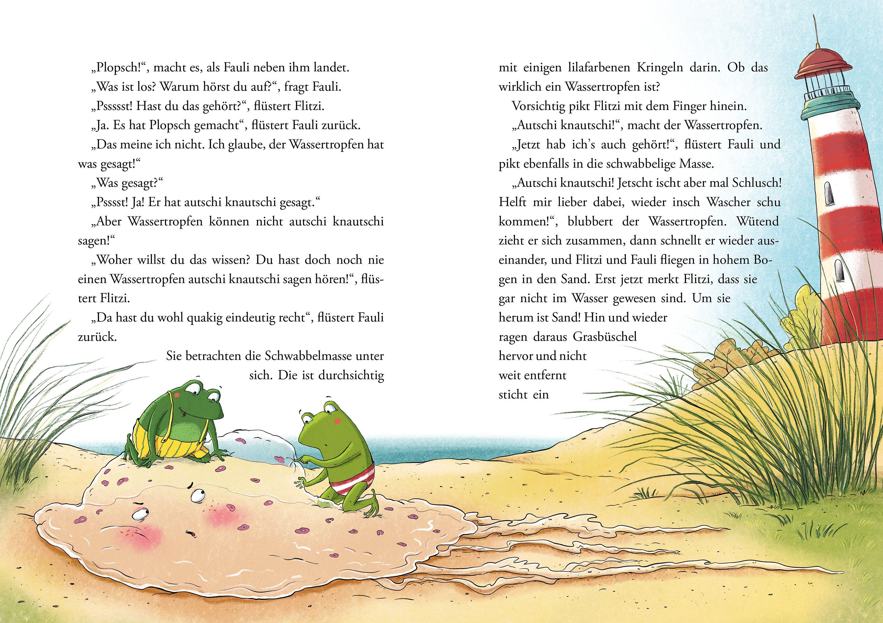 Das klingt nach Abenteuer, da wollen die Froschkinder Flitzi, Fauli und Küken natürlich unbedingt dabei sein! Doch dann plumpsen Flitzi und Fauli während des Fluges vom Storchrücken und landen auf einer kleinen Insel mitten in der Nordsee. Wie sollen sie jetzt wieder nach Hause kommen?