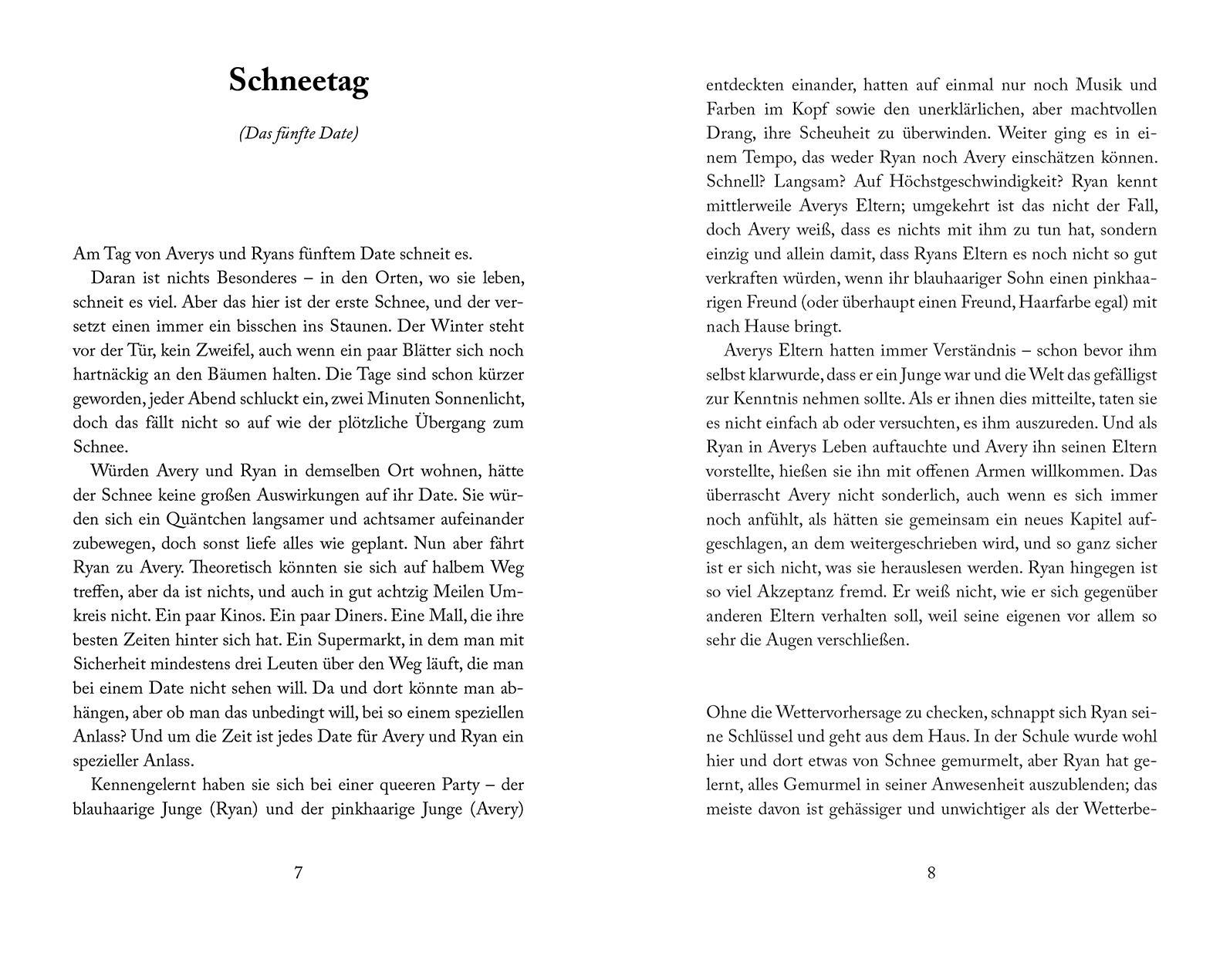 Der neue Roman von Bestsellerautor David Levithan (»Letztendlich sind wir dem Universum egal«) Avery, 16, pinke Haare, kann sein Glück kaum fassen: er ist verliebt! In Ryan, 16 Jahre, blaue Haare. Und Ryan ist verliebt in Avery. Nach den ersten schüchternen Begegnungen, verbringen sie immer mehr Zeit zusammen, machen verrückt-verknallte Dinge: Schneeballschlachten, feine Dinner-Dates und Kanufahrten im Sonnenuntergang. Mit jedem Date wächst die Nähe zwischen den beiden, und sie entdecken ihre Seelenverwandtschaft. Alles könnte wunderbar sein. Wären da nicht Ryans Eltern, die glauben, es besser zu wissen, und ihren Sohn von Avery fernhalten wollen. Ryan und Avery müssen für ihre Liebe kämpfen ... Zehn Dates = zehn Kapitel = ein Roman voller zärtlicher Unsicherheit, Herzschmerz und dem Wagnis, sich ganz auf jemand anderen einzulassen - jeden Tag und bei jedem Date aufs Neue. Pressestimmen zur amerikanischen Originalausgabe: »Eine LGBTQIA+-Romanze zum Dahinschmelzen und mit viel Herz.« School Library Journal»Eine wunderschöne queere Liebesgeschichte.« The Pink News»Liebesgeschichten gehören zu dem, was David Levithan am besten kann, und diese Neuerscheinung erfüllt alle Erwartungen.« Queerty