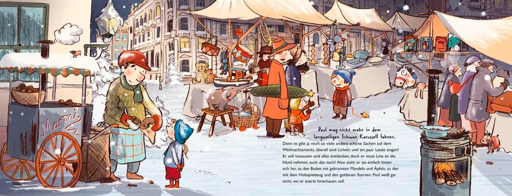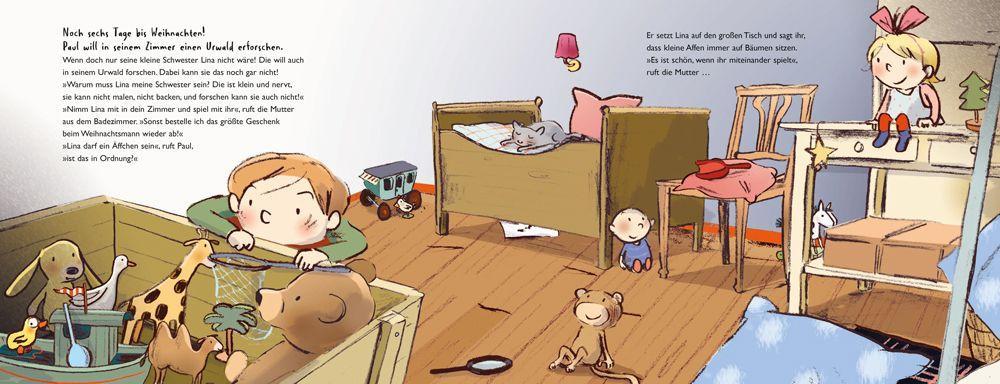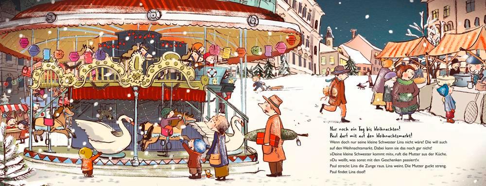Wenn der große Bruder mit seiner kleinen Schwester auf Weihnachten wartet.Noch acht Tage bis Weihnachten. Paul hat viele Ideen, sich die Wartezeit zu verkürzen. Wenn da nicht Lina wäre. Egal was er spielen will, immer muss seine kleine Schwester dabei sein. Mama will das so. Aber Lina kann doch noch gar kein Bild malen oder ein Lebkuchenhaus backen oder Indianer spielen. Sie nervt einfach nur. Und dann darf Lina auch noch mit zum Weihnachtsmarkt. Paul soll gut auf sie aufpassen. Und plötzlich ist sie in all dem Glitzerglanz verlorengegangen. Jetzt hat Paul ein bisschen Angst. Zusammen mit Mama und Papa macht er sich auf die Suche. Er will Lina wiederhaben, Weihnachten ohne Lina geht doch nicht. Aber Lina hat sich nur heimlich zu den Engeln beim Krippenspiel geschmuggelt. Da ist Paul aber froh! Lina sieht aus wie ein Engel. Und Paul ist stolz auf sie. Sie ist zwar klein aber ein echter Weihnachtsengel. Eine fröhliches und nostalgisch illustriertes Bilderbuch, das Kindern die Wartezeit bis Heiligabend verkürzt.
