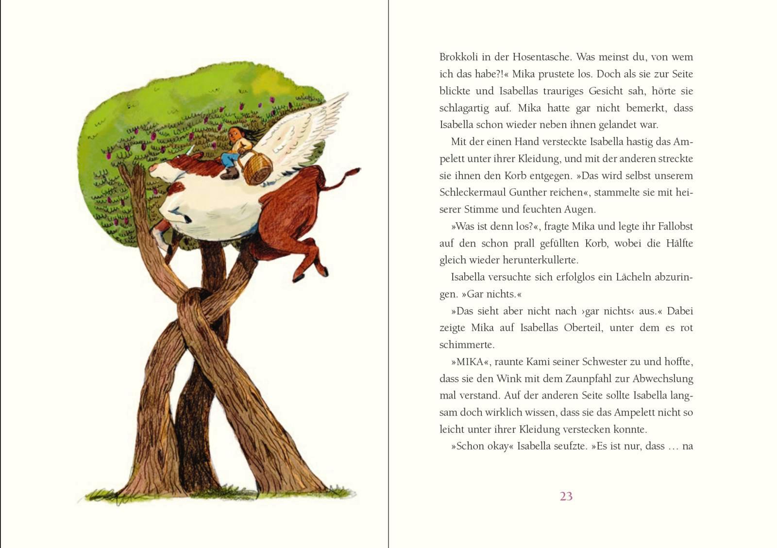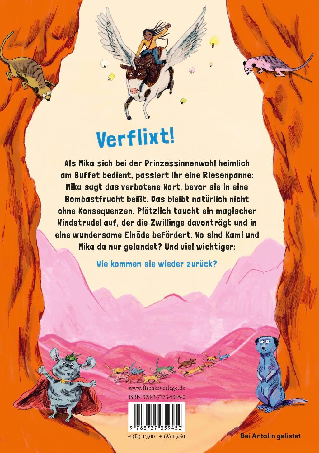 Verflixt! Als Mika sich bei der Prinzessinnenwahl heimlich am Büffet bedient, passiert ihr eine Riesenpanne: Mika sagt das verbotene Wort, bevor sie in eine Bombastfrucht beißt. Das bleibt natürlich nicht ohne Konsequenzen. Plötzlich taucht ein magischer Windstrudel auf, der die Zwillinge davonträgt und in eine wundersame Einöde befördert. Wo sind Kami und Mika da nur gelandet? Und viel wichtiger: Wie kommen sie wieder zurück?