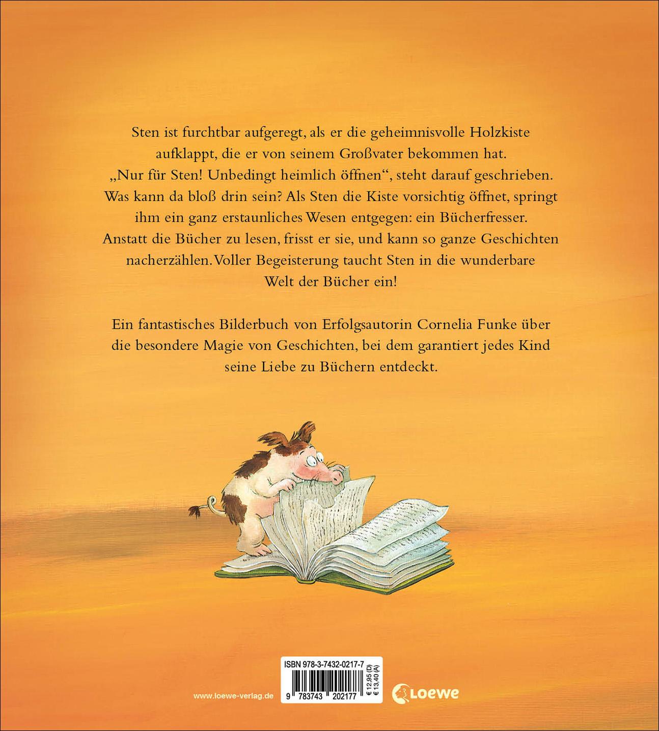 Das Buch ist bei deiner Buchhandlung vor Ort und bei vielen Online-Buchshops erhältlich! + Aufwendig farbig illustriert + Perfekt geeignet zum Vorlesen + Detailreiche und liebevolle Illustrationen + Sten ist furchtbar aufgeregt, als er die geheimnisvolle Holzkiste aufklappt, die er von seinem Großvater bekommen hat. "Nur für Sten! Unbedingt heimlich öffnen", steht darauf geschrieben. Was kann da bloß drin sein? Als Sten die Kiste vorsichtig öffnet, springt ihm ein ganz erstaunliches Wesen entgegen: ein Bücherfresser. Anstatt die Bücher zu lesen, frisst er sie, und kann so ganze Geschichten nacherzählen. Voller Begeisterung taucht Sten ein in die wunderbare Welt der Bücher! Nach den beliebten Erzählungen Der Mondscheindrache und Der Mäuseritter kommt nun eine weitere spannende Geschichte von Bestsellerautorin Cornelia Funke (Tintenherz-Trilogie, Die Wilden Hühner, Drachenreiter) als Bilderbuch zum Vorlesen. Eine fantastische Geschichte über den Zauber von Büchern, mit farbigen Illustrationen von Annette Swoboda für Kinder ab 4 Jahren. Cornelia Funke erhielt den deutschen Jugendliteraturpreis 2020 für ihr literarisches Gesamtwerk.