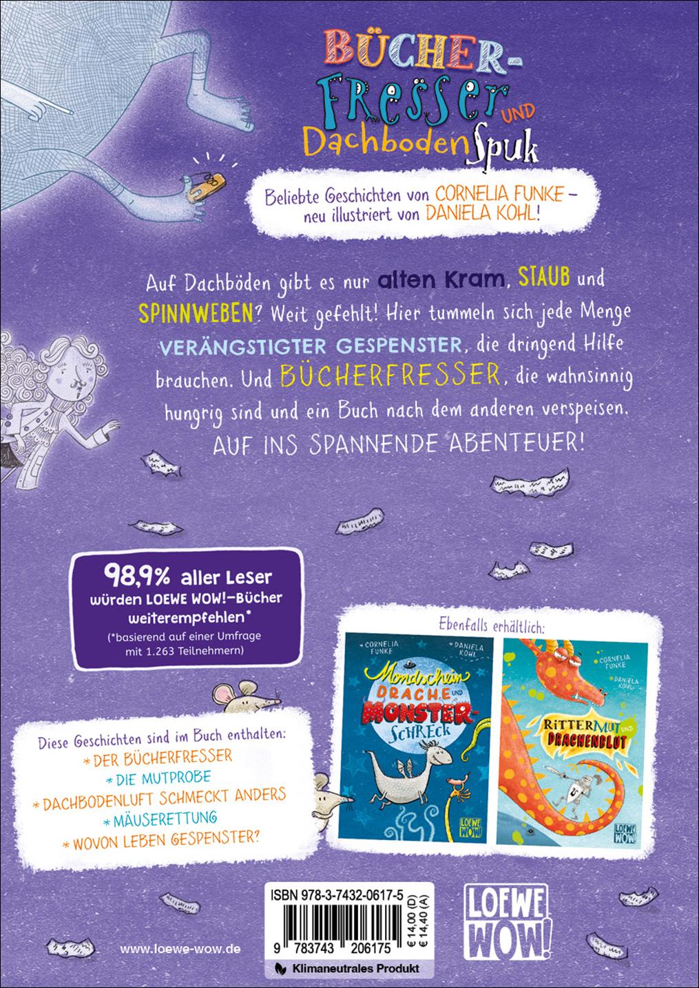 Das Buch ist bei deiner Buchhandlung vor Ort und bei vielen Online-Buchshops erhältlich! Beliebte Geschichten von Cornelia Funke - neu illustriert von Daniela Kohl Auf Dachböden gibt es nur alten Kram, Staub und Spinnweben? Weit gefehlt! Hier tummeln sich jede Menge verängstigter Gespenster, die dringend Hilfe brauchen. Und Bücherfresser, die wahnsinnig hungrig sind und ein Buch nach dem anderen verspeisen. Auf ins spannende Abenteuer! Diese Geschichten sind im Buch enthalten: - Der Bücherfresser - Die Mutprobe - Dachbodenluft schmeckt anders - Mäuserettung - Wovon leben Gespenster? Fünf spannende Geschichten von Bestsellerautorin Cornelia Funke sind hier wunderschön gestaltet worden von Starillustratorin Daniela Kohl (Mein Lotta-Leben). Für Kinder ab 7 Jahren zum Vorlesen und zum ersten Selberlesen. Diese Klassiker sind modern, neu und durchgehend farbig illustriert! Klimaneutrales Produkt - Wir unterstützen ausgewählte Klimaprojekte!