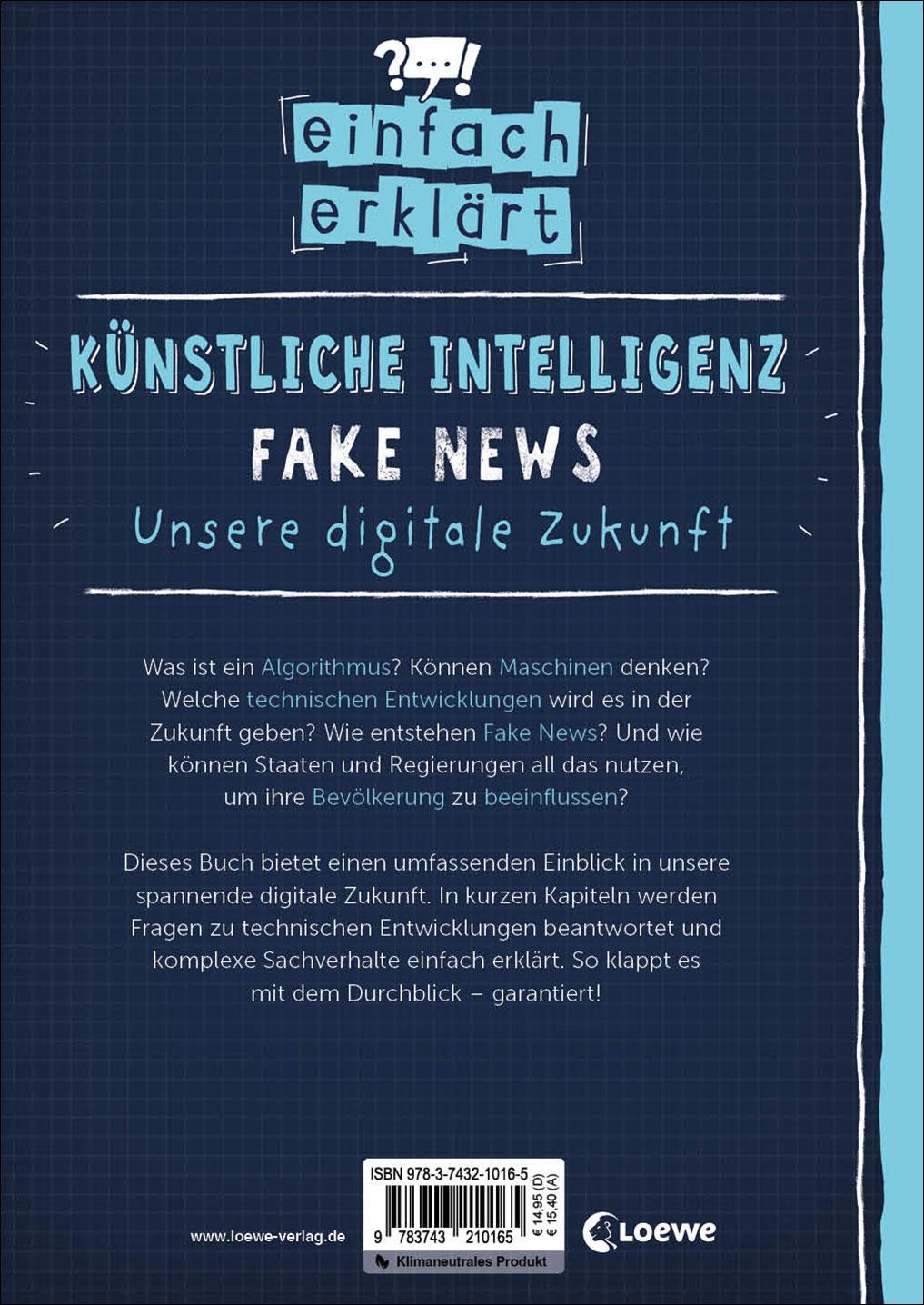 "Ein sehr gelungener Ratgeber zu einem aktuellen, wichtigen Thema." Tamara Böhm, Plankstadt "Hier erklärt uns Autor Manfred Theisen ganz ohne künstliche Intelligenz, was diese ist und wie sie unser Leben beeinflusst." lese_sessel, 13.06.2023 "Der Reihentitel der Loewe-Sachbücher, "einfach erklärt", ist Programm - und doch wird es kaum jemanden geben, der hier nichts Neues erfährt. Hervorragend recherchiert und mit klaren Infografiken ansprechend aufbereitet." Der Standard "Ein ebenso informatives wie spannendes Sachbuch, das für Erwachsene ebenso spannend ist wie für Kinder und Jugendliche. Wertvoll, unbedingt lesen!" Projekt Mami, 03.06.2023 "Manfred Theisen macht deutlich, dass technische Entwicklungen ziemlich komplex sein können. Doch keine Angst: Dieses Buch verschafft dir beim Gang in die digitale Zukunft einen tollen Durchblick." Mannheimer Morgen "Nach Einfach erklärt - Künstliche Intelligenz - Fake News - Unsere Digitale Zukunft kannst du erklären, was Algorithmen sind u