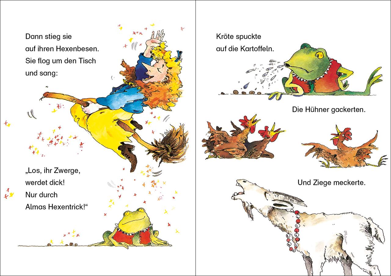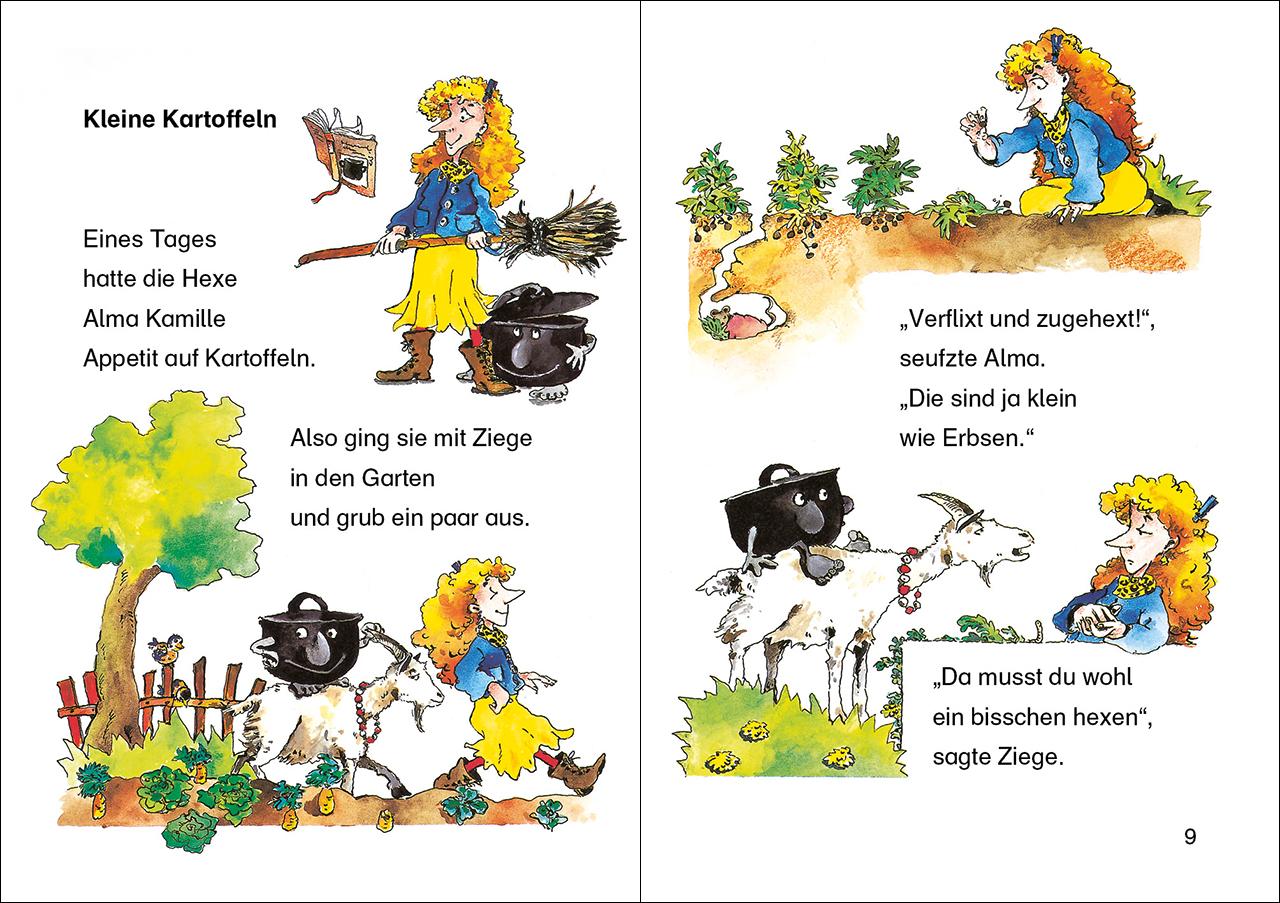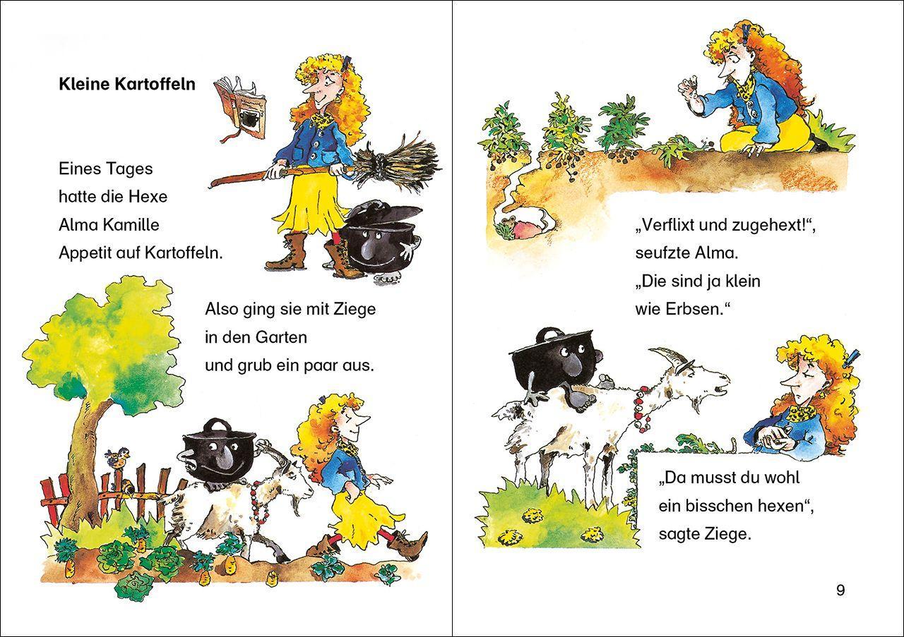 Hexenchaos mit Alma Kamille! Verflixt und zugehext! Das sind aber mickrige Kartoffeln, die Hexe Alma da auf ihrem Tisch liegen hat. Aber mit dem richtigen Hexenspruch ist das Problem doch ratzfatz gelöst. Doch was ist das? Plötzlich sind die Kartoffeln riesengroß und Alma Kamille ist klitzeklein! Ob sie den Gegenzauber hinbekommt? Unterstützen Sie Ihr Kind mit diesem Erstleseklassiker beim Lesenlernen
