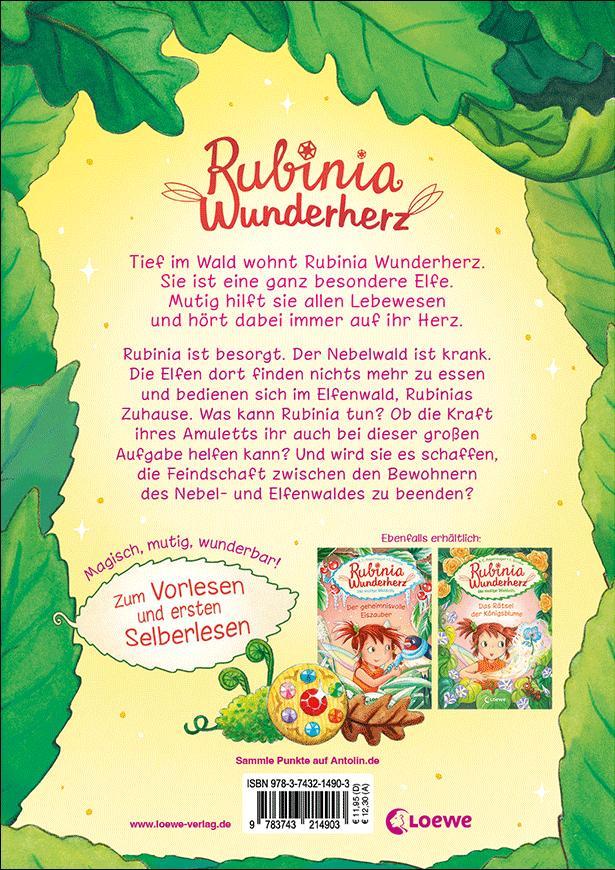 Rubinia ist besorgt. Der Nebelwald ist krank. Die Elfen dort finden nichts mehr zu essen und bedienen sich im Elfenwald, Rubinias Zuhause. Was kann Rubinia tun? Ob die Kraft ihres Amuletts ihr auch bei dieser großen Aufgabe helfen kann? Und wird sie es schaffen, die Feindschaft zwischen den Bewohnern des Nebel- und Elfenwaldes zu beenden?