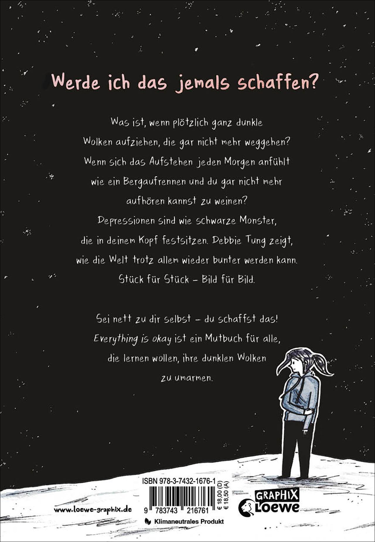 Werde ich das jemals schaffen? Was ist, wenn am Horizont plötzlich ganz dunkle Wolken aufziehen, die gar nicht mehr weggehen? Wenn sich das Aufstehen jeden Morgen anfühlt wie ein Bergaufrennen und du gar nicht mehr aufhören kannst zu weinen? Debbie Tung zeichnet ihre Depression als ein schwarzes Monster, das in ihrem Kopf sitzt. Als einen Ozean, in dem sie zu ertrinken droht, oder dunkle Wolke, die sie erstickt. Aber sie lernt, ihre Ängste zu akzeptieren, achtsamer mit sich umzugehen und auch einmal Nein zu sagen, wenn alles zu viel wird. Und Stück für Stück wird ihre Welt wieder bunter. Sei nett zu dir selbst - du schaffst das. Everything is okay ist ein Mutbuch für alle, die lernen wollen, ihre dunklen Wolken zu umarmen. Du bist auch in dunklen Stunden nicht allein Jeder redet über seinen Schnupfen, aber niemand über Depressionen und Angststörungen . Dabei sind sie die häufigste Krankheitsursache . Nach den Erfolgen von Quiet Girl und Book Love nimmt Debbie Tung diesem Thema durch ihre mutige und einfühlsame Darstellung das Tabu und macht Mut. Klimaneutrales Produkt - Wir unterstützen ausgewählte Klimaprojekte!