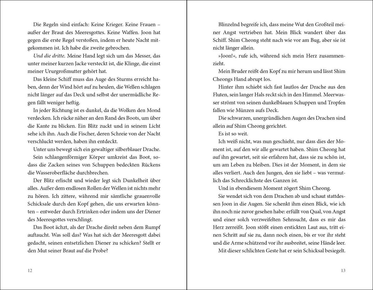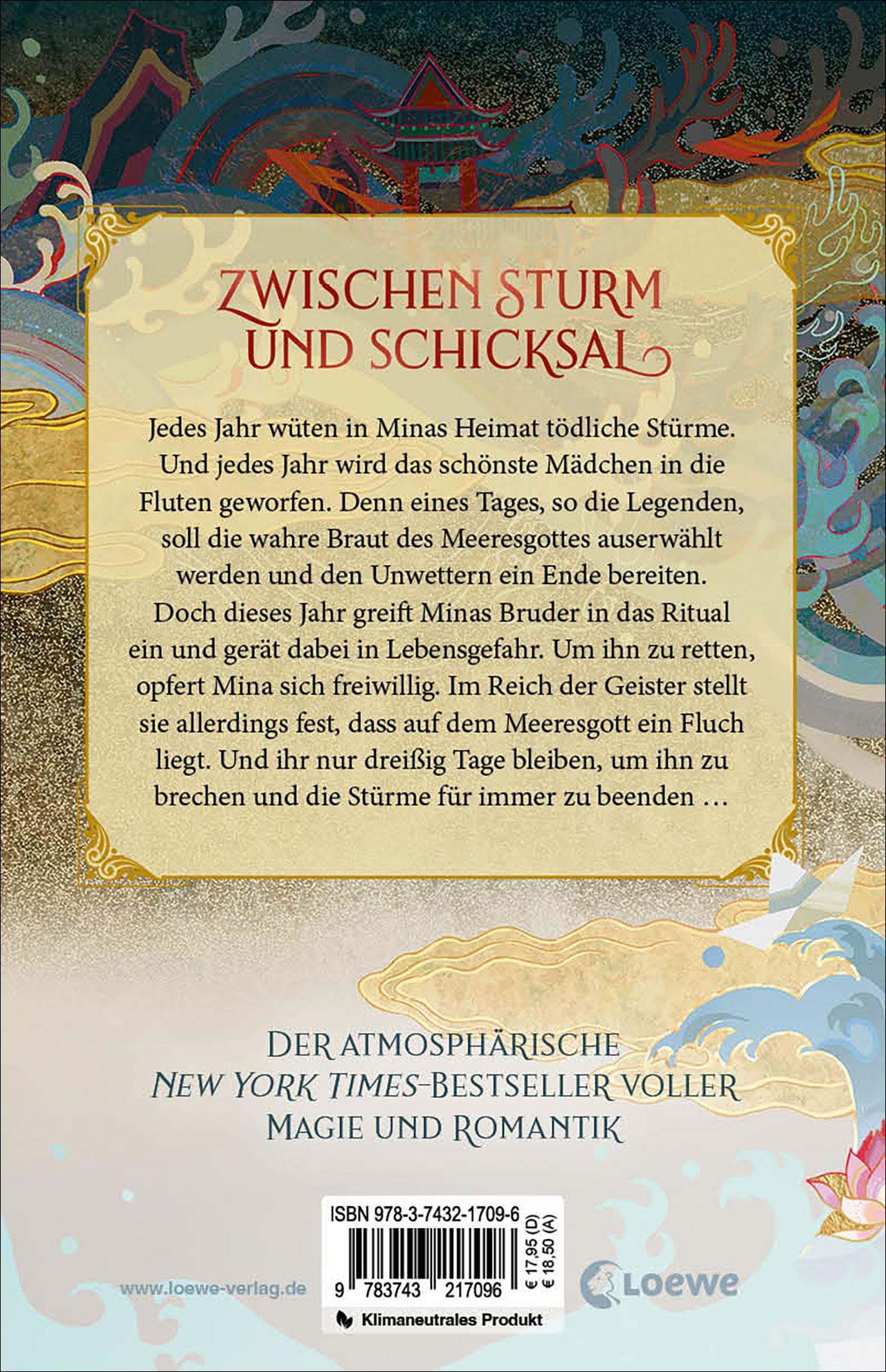Zwischen Sturm und Schicksal Jedes Jahr wüten in Minas Heimat tödliche Stürme. Und jedes Jahr wird das schönste Mädchen in die Fluten geworfen. Denn eines Tages, so die Legenden, soll die wahre Braut des Meeresgottes auserwählt werden und den Unwettern ein Ende bereiten. Doch dieses Jahr greift Minas Bruder in das Ritual ein und gerät dabei in Lebensgefahr. Um ihn zu retten, opfert Mina sich freiwillig. Im Reich der Geister stellt sie allerdings fest, dass auf dem Meeresgott ein Fluch liegt. Und ihr nur dreißig Tage bleiben, um ihn zu brechen und die Stürme für immer zu beenden ... Tauche ein in die atmosphärische Fantasywelt dieses New York Times-Bestsellers! Mit dieser fesselnden Geschichte entführt uns Axie Oh in die koreanische Mythologie und eine Welt voller Magie, Wunder und Romantik und erweckt dabei die Geisterwelt Koreas für ihre Leser*innen zum Leben. Ein bewegendes Retelling der Sage um Shim Cheong mit Female Empowerment, Abenteuer und ein Highlight für alle Fantasyfans!