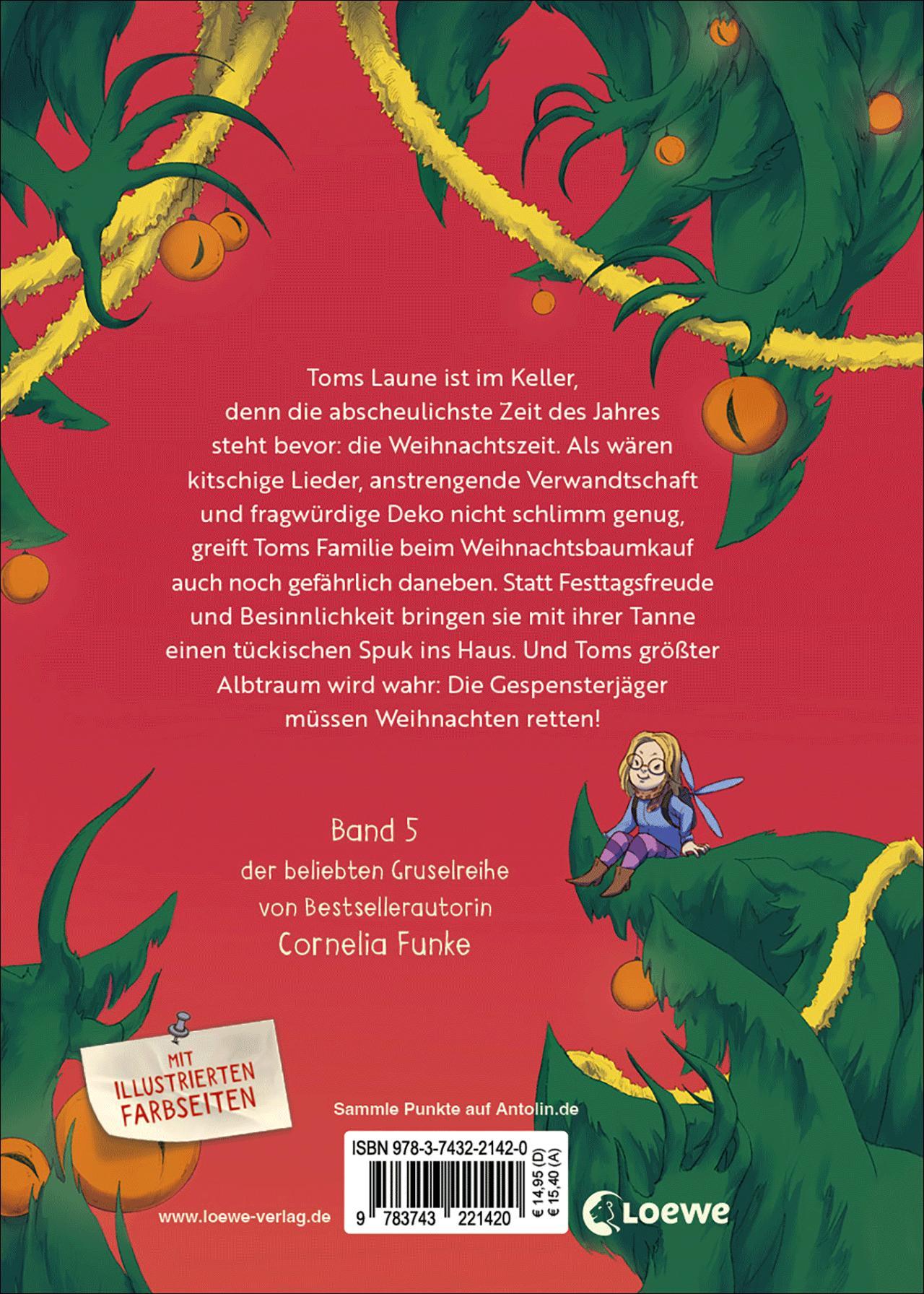 Kümmelsaft und Co. auf Gespensterjagd!Toms Laune ist im Keller, denn die abscheulichste Zeit des Jahres steht bevor: Weihnachten. Als wären kitschige Lieder, anstrengende Verwandtschaft und fragwürdige Deko nicht schlimm genug, greift Toms Familie beim Weihnachtsbaumkauf auch noch gefährlich daneben. Statt Festtagsfreude und Besinnlichkeit bringt ihre Tanne Grauen und Gefahr ins Haus. Und Toms größter Albtraum wird wahr: Die Gespensterjäger müssen Weihnachten retten!Band 5 der beliebten Erfolgsreihe von Bestsellerautorin Cornelia FunkeEine Sensation: Endlich geht die Geschichte um Tom, Hedwig und Hugo weiter! Die Gespensterjäger von Bestsellerautorin Cornelia Funke begeben sich auf ein weihnachtliches Grusel-Abenteuer. Die Klassiker-Reihe für Kinder ab 8 Jahren und zum Vorlesen verspricht schaurig-schöne Lesestunden!