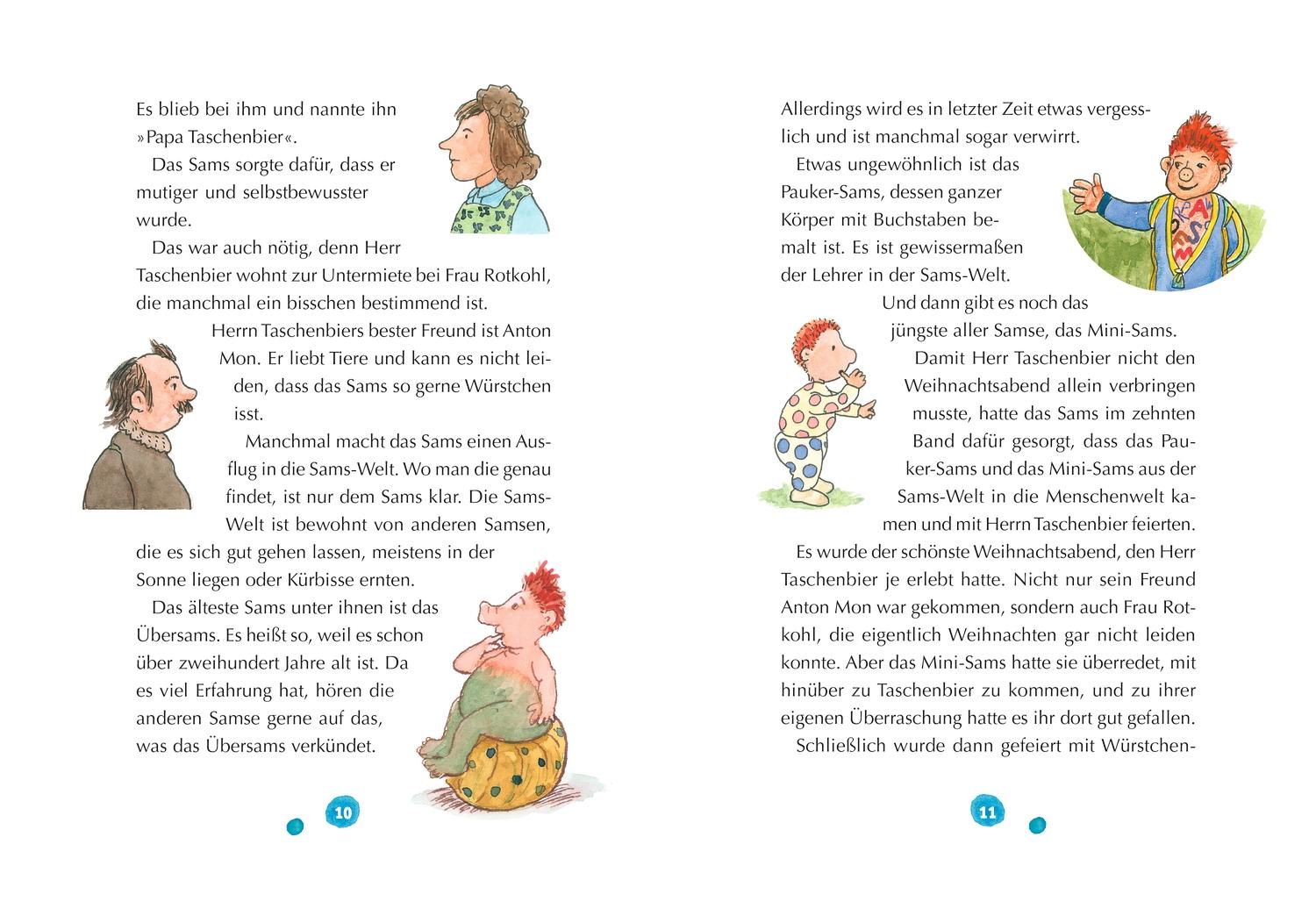 In "Das Sams und die Weihnachtssuche", dem elften Band der beliebten Kinderbuchreihe von Paul Maar, erlebt das Sams seinen ersten Weihnachtstag in der Menschenwelt, eine Fortsetzung des zauberhaften Heiligabends, den es zusammen mit Papa Taschenbier, Frau Rotkohl und vor allem dem Mini-Sams genossen hat. Nach einer Nacht voller Weihnachtslieder, Geschenken und Würstchenketten im Christbaum, sehnen sich alle nach der Rückkehr des Mini-Sams, dessen Besuch einen Hauch von Magie in ihr Fest gebracht hat. Doch der Versuch, das Mini-Sams zurückzuholen, scheitert an einem zu komplexen Zauberspruch, der es stattdessen auf eine unerwartete, turbulente Odyssee durch die Menschenwelt schickt. Während das Mini-Sams sich in einer Reihe von ungewollt komischen Situationen wiederfindet, setzen das Sams, Papa Taschenbier und Frau Rotkohl alles daran, es zurück zu finden und ihren Weihnachtstag zu retten. Die Geschichte entfaltet sich als ein humorvolles, abenteuerliches Chaos, das die Leser durch eine Welt voller Missverständnisse und schiefgegangener Zaubersprüche führt.Die Geschichte verbindet die magische Samswelt mit den Traditionen und der Atmosphäre der Weihnachtszeit in der Menschenwelt. Es entsteht eine humorvolle und spannende Erzählung voller Missverständnisse und Abenteuer, die das Wesen der Weihnacht - Freundschaft, Familie und die Freude am Beisammensein - unterstreicht. Durch das Zusammentreffen verschiedener Welten entdeckt das Mini-Sams die Besonderheiten menschlicher Weihnachtstraditionen, während die Suche nach ihm zu komischen wie berührenden Momenten führt, die das Herz erwärmen.Dieser Weihnachtsband kann unabhängig von den anderen Bänden der Reihe gelesen werden, ist aber leichter verständlich und noch unterhaltsamer in Verbindung mit Band 9, "Das Sams feiert Weihnachten".Band 1: Eine Woche voller Samstage