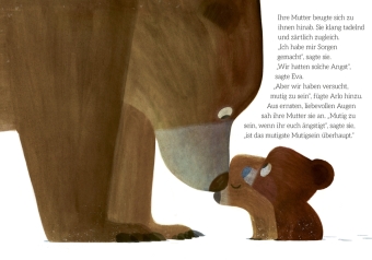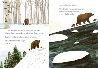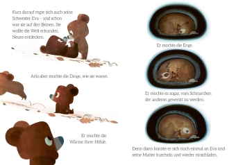 Schau dir die kuschelige Höhle an, in der der kleine Bär Arlo mit seiner Schwester Eva und seiner Mutter lebt: hach, wie warm und gemütlich. Da fühlt Arlo sich wohl und sicher. Doch der Winter ist fast vorbei, und es wird Zeit, ins Tal zu ziehen. Dabei würde Arlo die Dinge viel lieber so lassen, wie sie waren. Die neugierige Eva dagegen freut sich und läuft aufgeregt voran. Auf dem Weg muss die kleine Bärenfamilie einen verschneiten Berg überqueren. "Bleibt in meiner Nähe", ruft Mama-Bär, denn plötzlich kommt ein heulender Schneesturm auf. Arlo merkt sofort, dass seine Schwester zu weit vorgelaufen ist, und er hört sie rufen! Arlo hat zwar Angst, aber er weiß genau, was er tun muss und läuft mutig los.