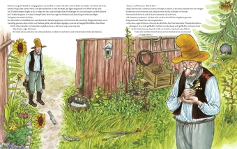 "Nordqvists kolorierte Zeichnungen gehören zum besten, was man als Bilderbuch bekommen kann. Es sind überschäumende Wimmelbilder, bei denen die Hauptpersonen aber immer höchst raffiniert charakterisiert und in Szene gesetzt sind. Drumherum aber findet man bei jedem Mal neue Details: Die eben schon erwähnten Mucklas, Gerümpel und Werkzeuge, mit denen Pettersson in den nächsten Bänden seine verblüffenden Erfindungen basteln wird, eine abwechslungsreiche Landschaft voller Bäume, Pflanzen, Insekten und schwedisch-roter Häuschen. Und eben die Protagonisten, denen der Schalk aus allen Knopflöchern blitzt. Dazu ein schlichter, aber sehr anschaulicher Text voller Dialoge, perfekt zum Vorlesen und Anhören. Alles zusammen ein herzerwärmender optischer und emotionaler Genuss, der ganz zeitlos jeden Leser davon träumen lässt, in diesem Land zu leben. - Muss ich noch einmal wiederholen, dass ich diese Bücher liebe? Ich kann es nicht anzeigen lassen - aber sechs Sterne verdient das Buch mindest