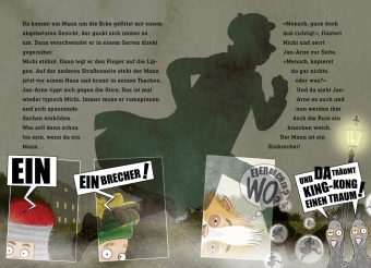 Einsatz für King-Kong! Dass das Leben so aufregend sein kann, das hätten Jan-Arne und Michi nie gedacht. Eigentlich wollten sie ja nur mit King-Kong zum Zoogeschäft. Und jetzt stehen sie hier in der Dunkelheit und beschatten einen Einbrecher. Oder wie nennt man wohl sonst einen Mann, der versucht, ohne Schlüssel in ein Haus zu kommen? Zum Glück hat Jan-Arne King-Kong dabei, der fühlt sich so weich und warm an und hat überhaupt keine Angst vor Einbrechern.