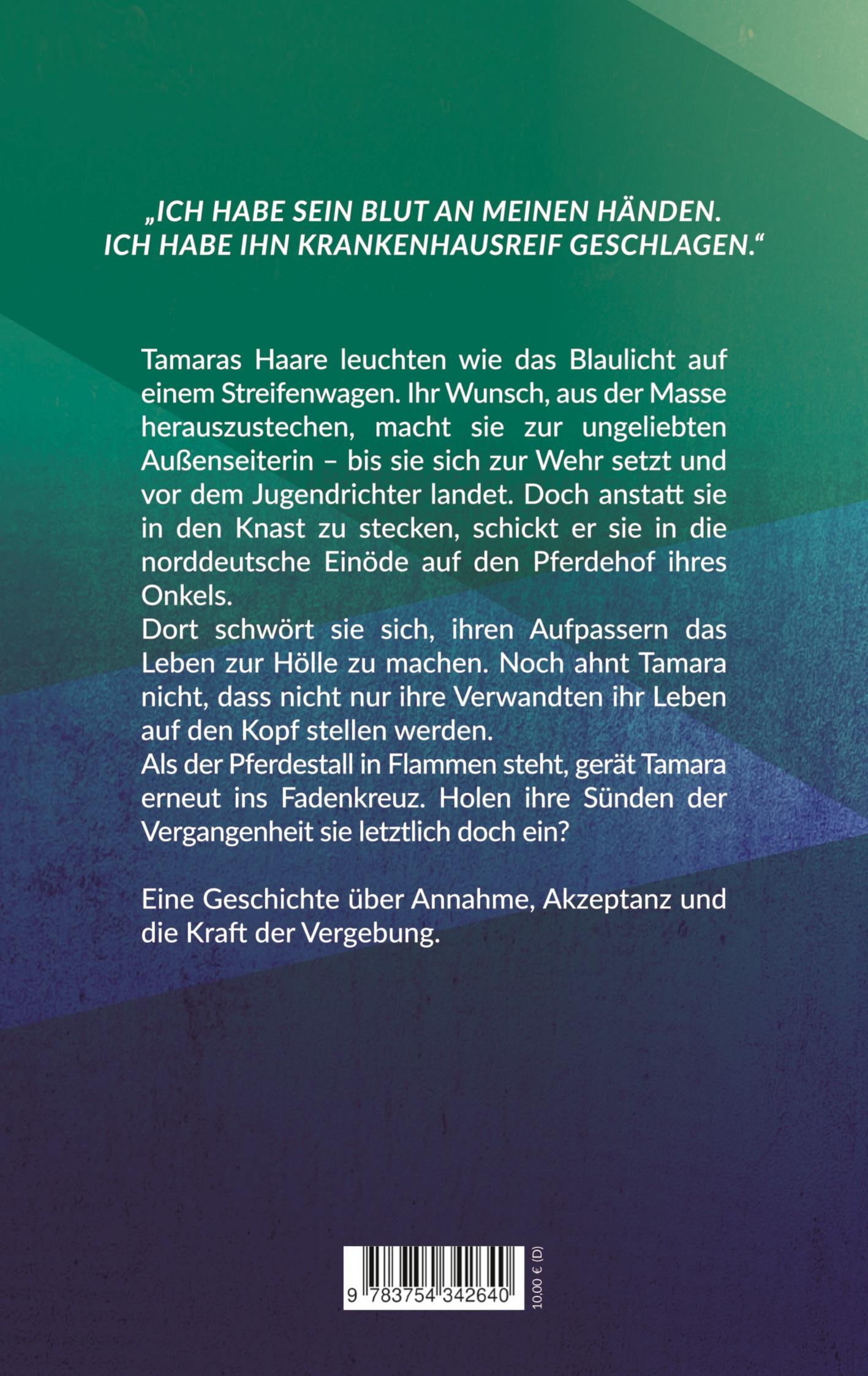 "Ich habe sein Blut an meinen Händen. Ich habe ihn krankenhausreif geschlagen."Tamaras Haare leuchten wie das Blaulicht auf einem Streifenwagen. Ihr Wunsch, aus der Masse herauszustechen, macht sie zur ungeliebten Außenseiterin - bis sie sich zur Wehr setzt und vor dem Jugendrichter landet. Doch anstatt sie in den Knast zu stecken, schickt er sie in die norddeutsche Einöde auf den Pferdehof ihres Onkels.Dort schwört sie sich, ihren Aufpassern das Leben zur Hölle zu machen. Noch ahnt Tamara nicht, dass nicht nur ihre Verwandten ihr Leben auf den Kopf stellen werden.Als der Pferdestall in Flammen steht, gerät Tamara erneut ins Fadenkreuz. Holen ihre Sünden der Vergangenheit sie letztlich doch ein? Eine Geschichte über Annahme, Akzeptanz und die Kraft der Vergebung.