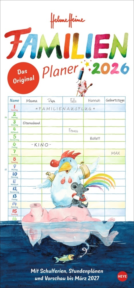 - 3 Freunde und ihre schönsten Erlebnisse: Der Familienplaner 2026 von Helme Heine - Gut geplant durchs Abenteuer Alltag, mit unserem meistverkauften Familienkalender: 5 Spalten Platz für alle wichtigen Termine von Groß und Klein - Ein echter Hingucker im Hochformat 21 x 45: Die Tiere von Mullewapp begeistern Helme-Heine-Fans jeden Alters!- Der praktische Kalender für Familien, die das Rundum-Sorglos-Paket wollen: Mit Schulferienübersicht, 2 Stundenplänen und 3-Monats-Vorschau auf das Folgejahr- Ein zeitloser Kalender-Klassiker aus dem Programm von Heye, im Athesia Kalenderverlag