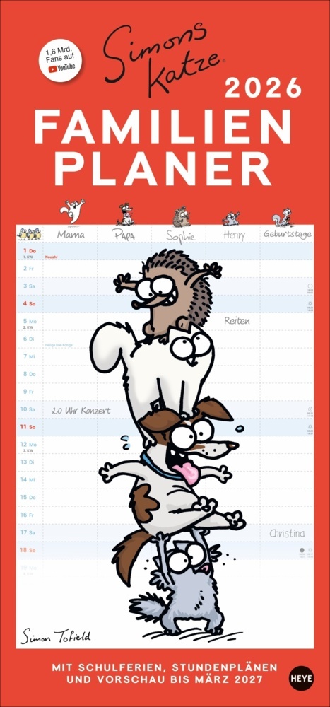 - Der freche Cartoon-Kater von Simon Tofield im praktischen Familienplaner: Der neue Simons Katze-Kalender 2026 ist da!- Für alle, die nicht genug von Simon's Cat bekommen können: Jeden Monat zaubert der bequeme Kater mit seinen Kapriolen ein Lächeln auf die Lippen von Groß und Klein- Familientermine mit Weitblick planen: Kalender mit Schulferien und 3-Monats-Vorschau aufs Folgejahr, im praktischen 21 x 45 cm Hochformat- Unser erfolgreiches Konzept für Familienplaner: 5 Spalten Platz für alles, was wirklich wichtig ist- Immer tierisch gut organisiert: Die Familien-Wandkalender von Heye aus dem Athesia Kalenderverlag